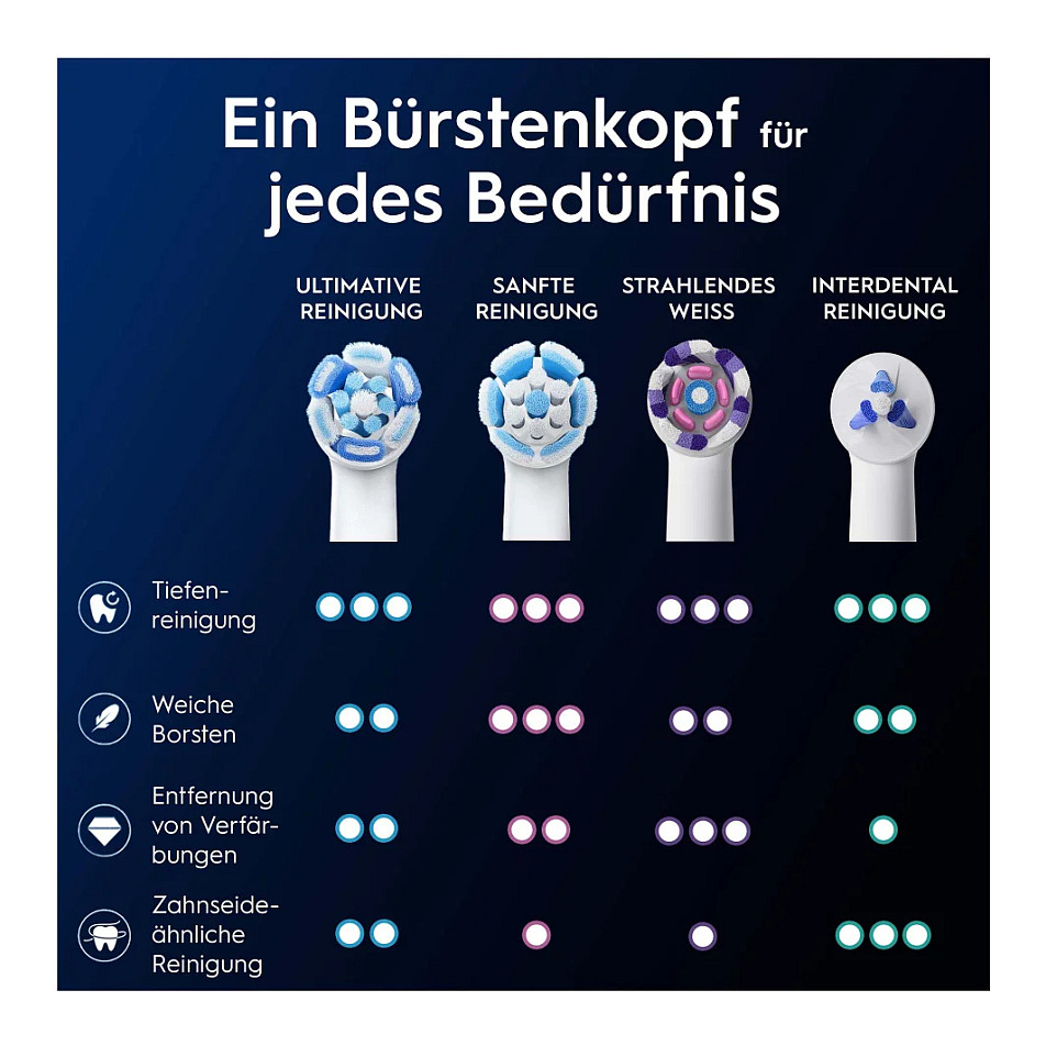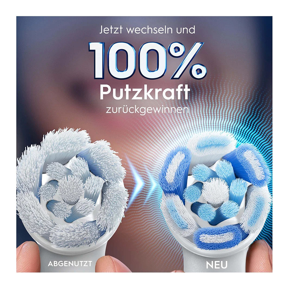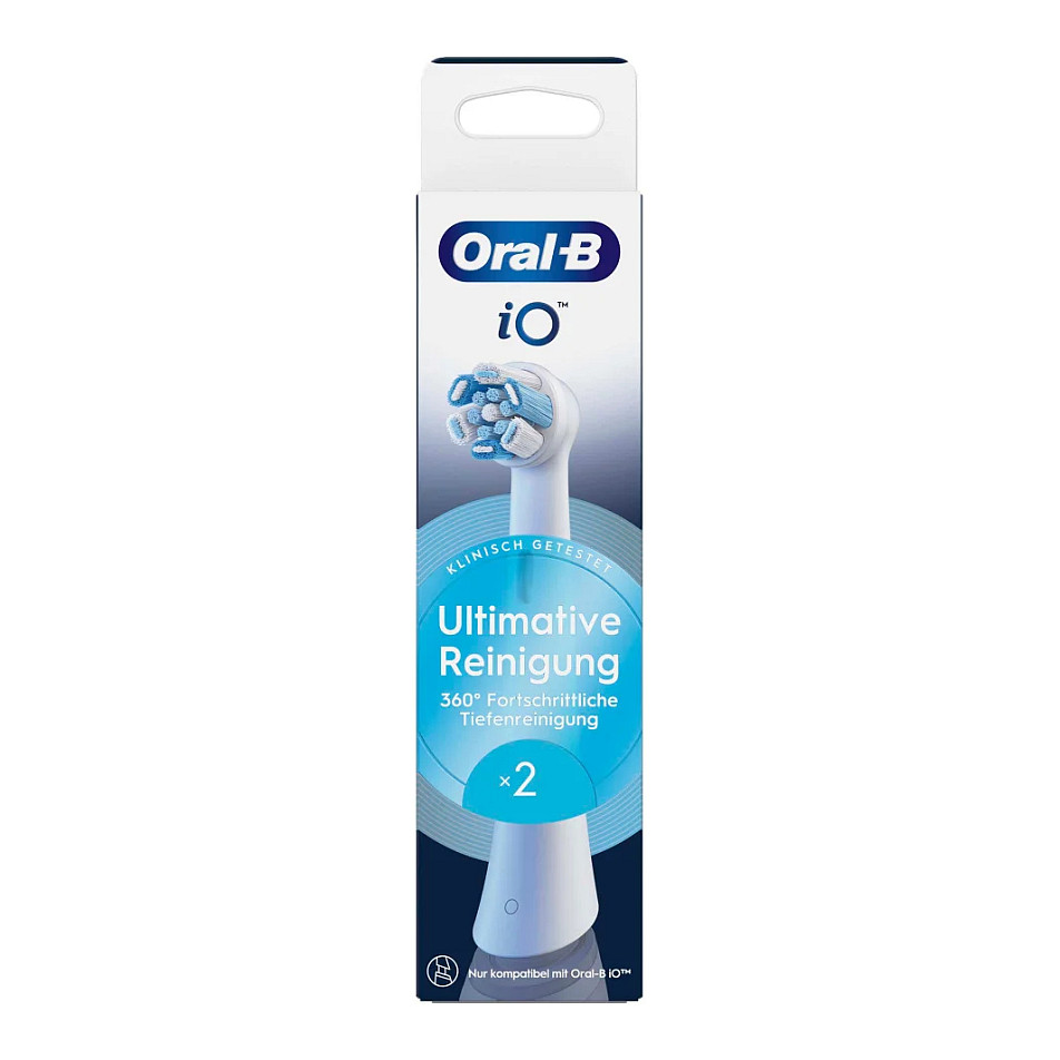 Die Oral-B iO Ultimative Reinigung Aufsteckbürsten kombinieren kraftvolle, aber sanfte Mikrovibrationen mit unserem einzigartigen, von ZahnärztInnen inspirierten runden Bürstenkopf für ein professionelles Reinigungsgefühl jeden Tag. Exklusiv für Oral-B iO elektrische Zahnbürsten entwickelt, helfen die Ultimative Reinigung Bürstenköpfe, bis zu 100% mehr Plaque als eine herkömmliche Handzahnbürste zu entfernen und lassen die Zähne sauber und hell erscheinen. Präzise auf 16 Grad geneigt, helfen die gebündelten Borsten, schwer erreichbare Stellen im Mund zu reinigen. Da ZahnärztInnen empfehlen, für beste Ergebnisse, den Bürstenkopf alle 3 Monate zu wechseln, verfügen Oral-B Ersatzbürstenköpfe über farbwechselnde Borsten, die signalisieren, wenn es Zeit für einen Wechsel ist. Überlegene Reinigungskraft mit den einzigen Aufsteckbürsten, die exklusiv - und garantiert passend - für die Oral-B iO elektrische Zahnbürste entwickelt wurden.