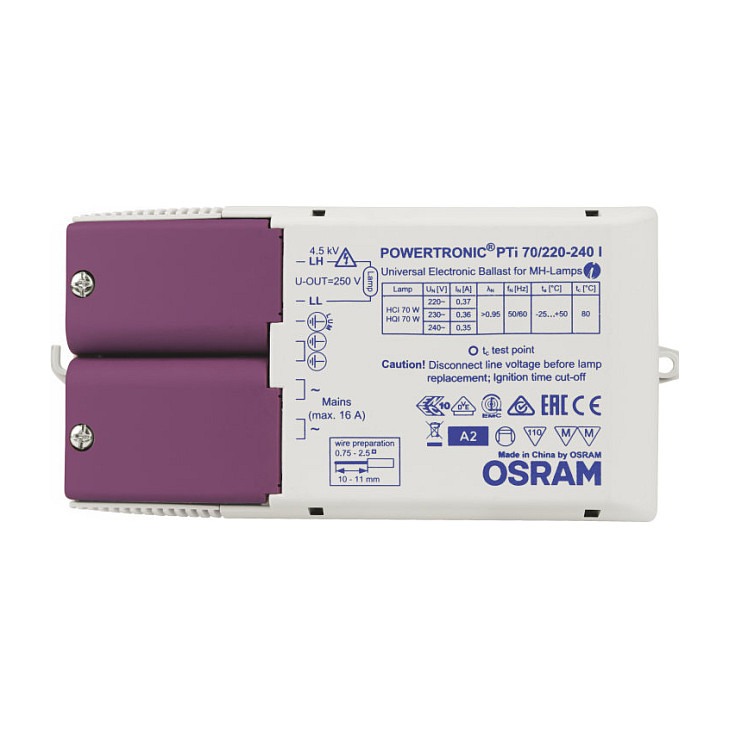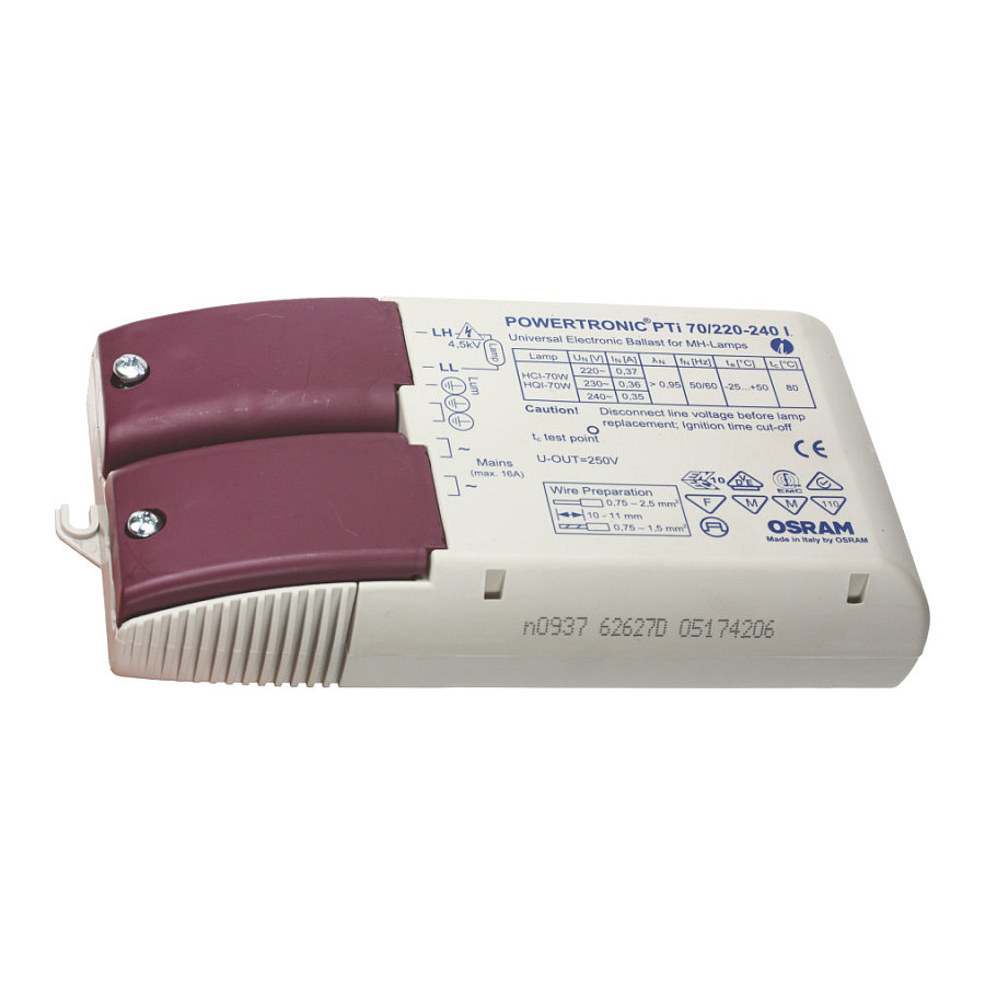 Osram PTi 70/220…240 I. Lebensdauer: 50000 h, Betriebstemperatur: -25 - 50 °C. AC Eingangsspannung: 198 - 264 V, Eingangsfrequenz: 50/60 Hz, Eingangsstrom: 45 A. Breite: 83 mm, Tiefe: 171 mm, Höhe: 32 mm