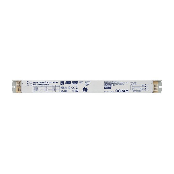 Osram QTi 1X35/49/80 GII. Lebensdauer: 100000 h, Betriebstemperatur: -20 - 50 °C. AC Eingangsspannung: 198 - 264 V, Eingangsfrequenz: 50/60 Hz, Eingangsstrom: 53 A. Breite: 30 mm, Tiefe: 360 mm, Höhe: 21 mm