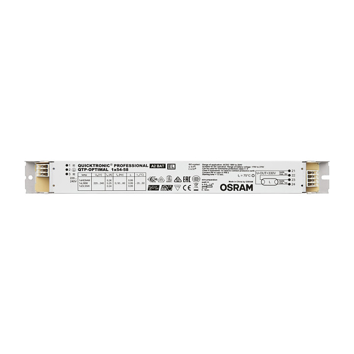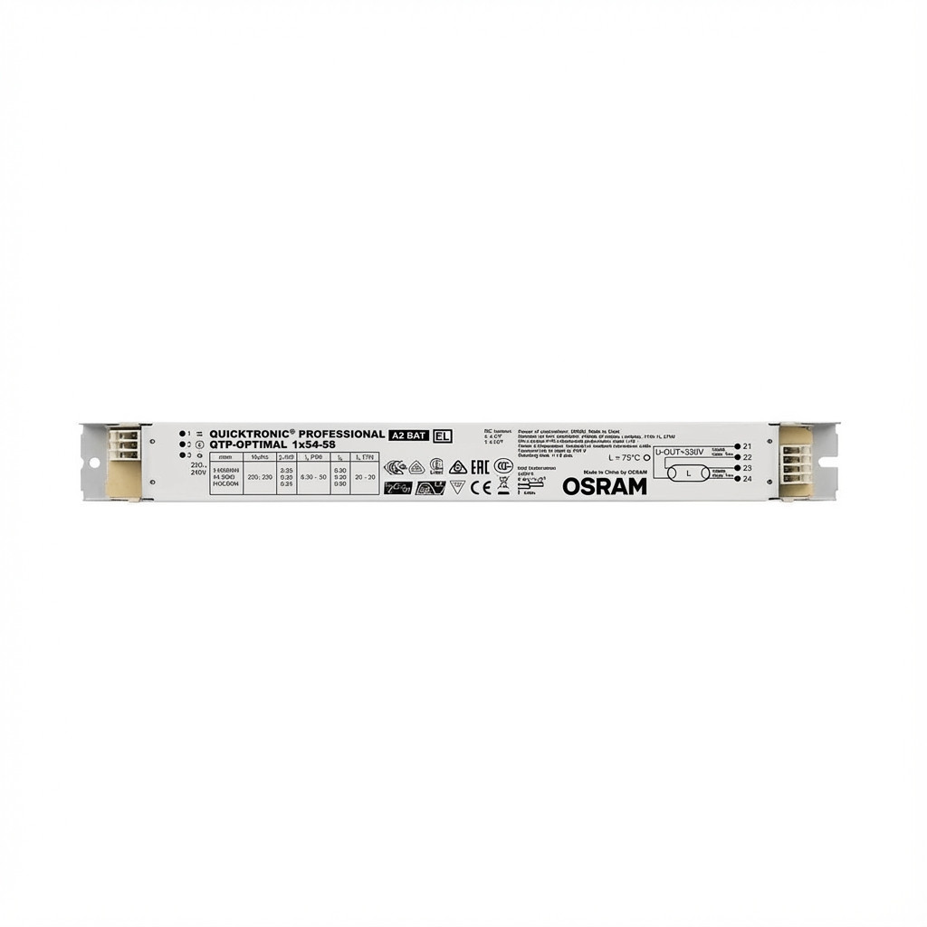 Osram QTP-OPTIMAL 1X54…58. Lebensdauer: 100000 h, Betriebstemperatur: -20 - 50 °C. AC Eingangsspannung: 198 - 264 V, Eingangsfrequenz: 50/60 Hz. Breite: 30 mm, Tiefe: 280 mm, Höhe: 21 mm