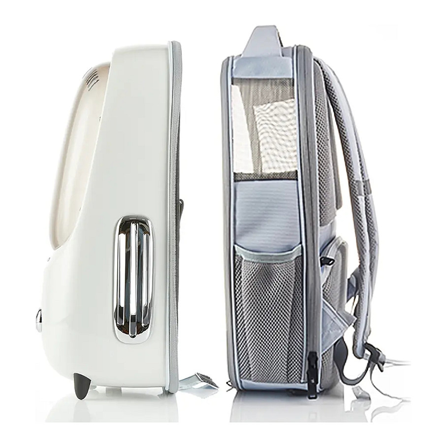 Der Rucksack verfügt über Seitentaschen, in denen du eine Powerbank für die Stromversorgung platzieren kannst, was umweltfreundlich und praktisch ist. Der Stauraum wurde erweitert, um Snacks und Wasser für deine Katze zu verstauen. Reflektierende Streifen wurden den Schulterriemen hinzugefügt, um das Reisen bei Nacht sicherer zu machen.