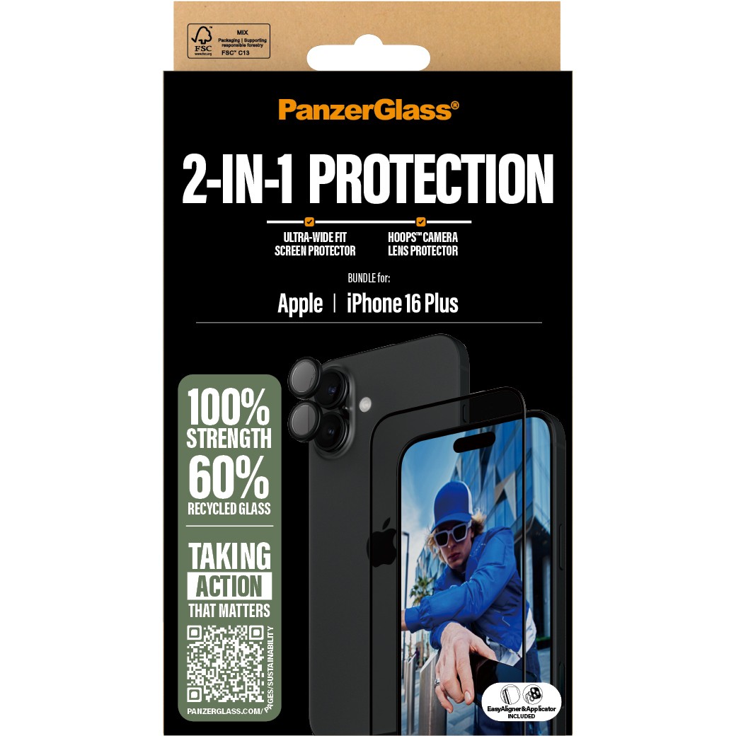 Das 2-in-1-Schutzpaket verlängert die Lebensdauer deines Handys, damit du es eines Tages an eine andere Person weitergeben kannst, die es genauso liebt wie du. Dies ist eine Möglichkeit, auf eine nachhaltigere Zukunft hinzuarbeiten. Eine andere ist, weniger Verpackung zu verwenden und sie nachhaltiger zu gestalten: Im Jahr 2024 haben wir die Papiermenge in unserem Verpackungsdesign für die Kernprodukte von PanzerGlass um durchschnittlich 66%* reduziert und liefern alle unsere Produkte in recycelbaren FSC®-zertifizierten Verpackungen aus.