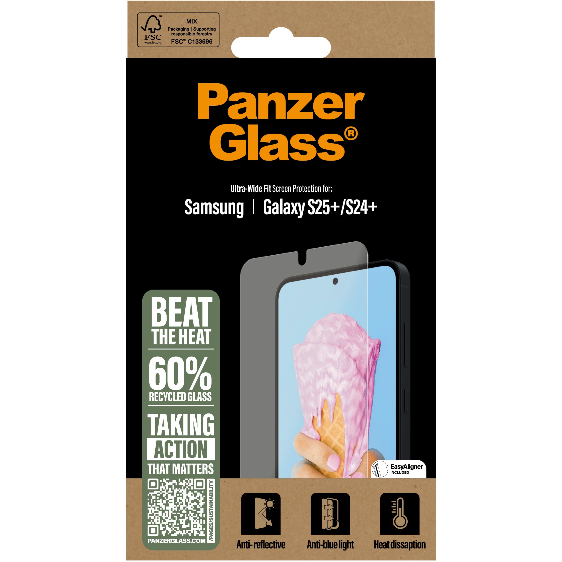 Entspiegelt? Ja! Blaulichtfilter? Ja! Kühlung und Wärmeableitung? Ja! Kratz- und stoßfest? Ja! Dieser neue Displayschutz von PanzerGlass® bringt den Schutz für Augen und Handy auf das nächste Level. Er minimiert Reflexionen von der Sonne und künstlicher Beleuchtung, sodass du immer sehen kannst, was auf deinem Display angezeigt wird, und reduziert das starke blaue Licht, das zu Augenbelastung und -ermüdung führen kann. Der Schutz leitet sogar Wärme ab, um dein heißes Handy bei sengender Sonne kühl zu halten. Und wenn du dir Sorgen um die Lesbarkeit von Fingerabdrücken machst, kannst du beruhigt sein: Der Displayschutz gewährleistet eine 100%ige Kompatibilität mit dem Ultraschall-Fingerabdruckleser deines Displays, sodass du sicher sein kannst, dass sich dein Handy jedes Mal problemlos entsperrenUnd der Displayschutz? Der ist hervorragend! Mit hoher Kratzfestigkeit und bahnbrechendem Fallschutz schützt der Displayschutz dein Display vor den Gefahren des Alltags, verlängert die Lebensdauer deines Handys und reduziert die Notwendigkeit eines vorzeitigen Austauschs. Dies ist eine Möglichkeit, auf eine nachhaltigere Zukunft hinzuarbeiten. Eine andere ist die Verwendung von weniger Verpackungen: Im Jahr 2024 haben wir die Papiermenge in der Verpackung unseres Kernprodukts PanzerGlass® um durchschnittlich 66 % reduziert.* Und natürlich liefern wir alle unsere Produkte weiterhin in recycelbaren, FSC®-zertifizierten Verpackungen aus.Der beiliegende EasyAligner aus 100 % recyceltem Plastik macht die Installation zum Kinderspiel (im Ernst!). Um es noch einfacher zu machen, haben wir eine Schritt-für-Schritt-Anleitung sowie einen QR-Code für den schnellen Zugriff auf unser Online-Video mit einer Anleitung beigefügt. Und denkt daran: Einmal installiert, müsst ihr nie wieder Angst haben, dass euer Handy mit dem Display voran auf den Boden fällt. Das wird zwar nicht passieren, aber andererseits ... vielleicht doch!Der Displayschutz ist Ultra-Wide Fit. Das bedeutet, dass er die Vorderseite deines Handys abdeckt und eine vollständige Sicht auf dein Display bietet, während an den Rändern etwas Platz für eine PanzerGlass®-Hülle bleibt, zum Beispiel eine furchtlos modische Hülle von CARE by PanzerGlass®. Und wenn du denkst: „Was ist, wenn meine Kameralinsen zerkratzt werden?“ Nun, Hilfe ist nur ein paar Klicks entfernt: Kombiniere deinen Displayschutz und deine Hülle mit PanzerGlass® PicturePerfect oder HoopsTM.*Reduzierung von 2022 bis 2024 gemessen durch Vergleich ausgewählter Produkte aus dem Kernsortiment von PanzerGlass®.