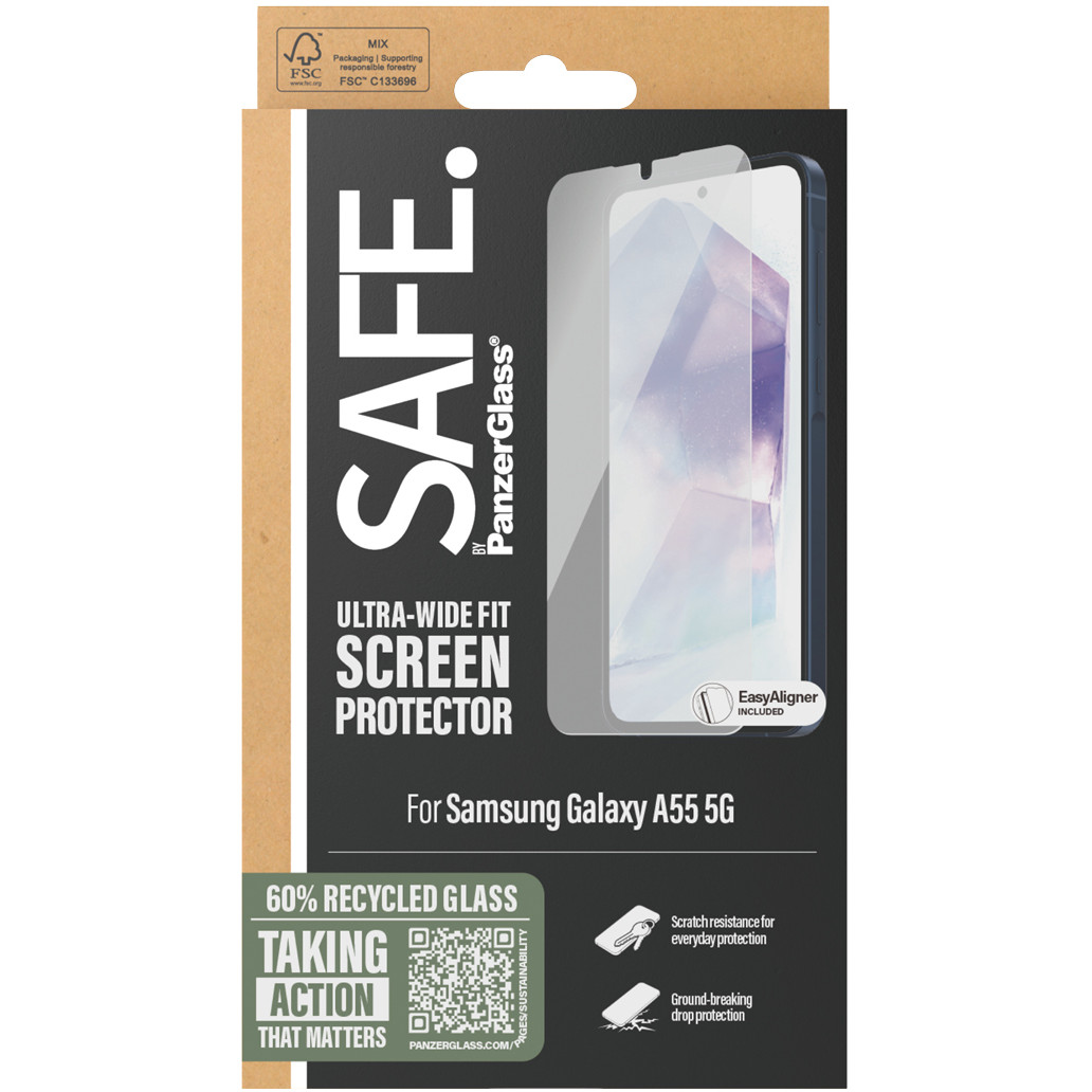 SAFE. ist echt. SAFE. ist für dich. SAFE. ist für Missgeschicke auf der Tanzfläche, für Selfies, die schief gehen, für alltägliches Fummeln, Fallenlassen und Displayschutz. Dieser SAFE. by PanzerGlass® Displayschutz aus 60 % recyceltem Material wirkt wie ein Airbag, der dein Handy vor Stößen und Kratzern schützt, ohne die Funktionalität und das Aussehen deines Geräts zu beeinträchtigen. Er hat sogar eine wischfeste Beschichtung, die Spuren von Fingerabdrücken und Fett reduziert. Kannst du es spüren? Liebe liegt in der Luft. Liebe für Handys und den Planeten. Das ist der neue Kreislauf des Handy-Lebens. Wenn du dein geliebtes Handy SAFE. aufbewahrst, kannst du es eines Tages an einen anderen Handy-Liebhaber weitergeben, der es genauso lieben wird wie du. Entscheide dich für SAFE. und schenke deinem Handy ein zweites, drittes oder viertes Leben! Das ist eine Möglichkeit, auf eine nachhaltigere Zukunft hinzuarbeiten! Eine andere ist die Verwendung nachhaltigerer Verpackungen. Deshalb wird dieses Produkt in einer recycelbaren, FSC®-zertifizierten Verpackung geliefert. Jeder hat es verdient, SAFE zu sein. Ohne Hektik, Bürokratie oder unnötige Komplexität. Dieser Displayschutz wird mit einem EasyAligner geliefert, der die Installation zum Kinderspiel macht (im Ernst!). Um ihn noch einfacher zu machen, haben wir eine Schritt-für-Schritt-Anleitung und einen QR-Code für den schnellen Zugriff auf unser Online-Anleitungsvideo beigefügt. Und denk daran: Du musst den Displayschutz nur einmal anbringen! Dann musst du nie wieder befürchten, dass dein Handy mit dem Displayschutz auf den Boden fällt. Das wird vielleicht nicht passieren, aber wenn doch, wirst du bereuen, dass du nicht auf "In den Warenkorb" geklickt hast. Kein Displayschutz ist eine schlechte Leistung des Displays wert! Das bedeutet, dass er die gesamte Vorderseite deines Handys abdeckt und so einen kristallklaren Blick auf den Displayschutz ermöglicht. Er lässt an den Rändern sogar noch ein wenig Platz für eine Hülle von CARE™ by PanzerGlass®. Und wenn du besonders SAFE. sein willst, kombiniere Displayschutz und Hülle mit einem SAFE. by PanzerGlass® Kameraschutz. Keep your phone SAFE.