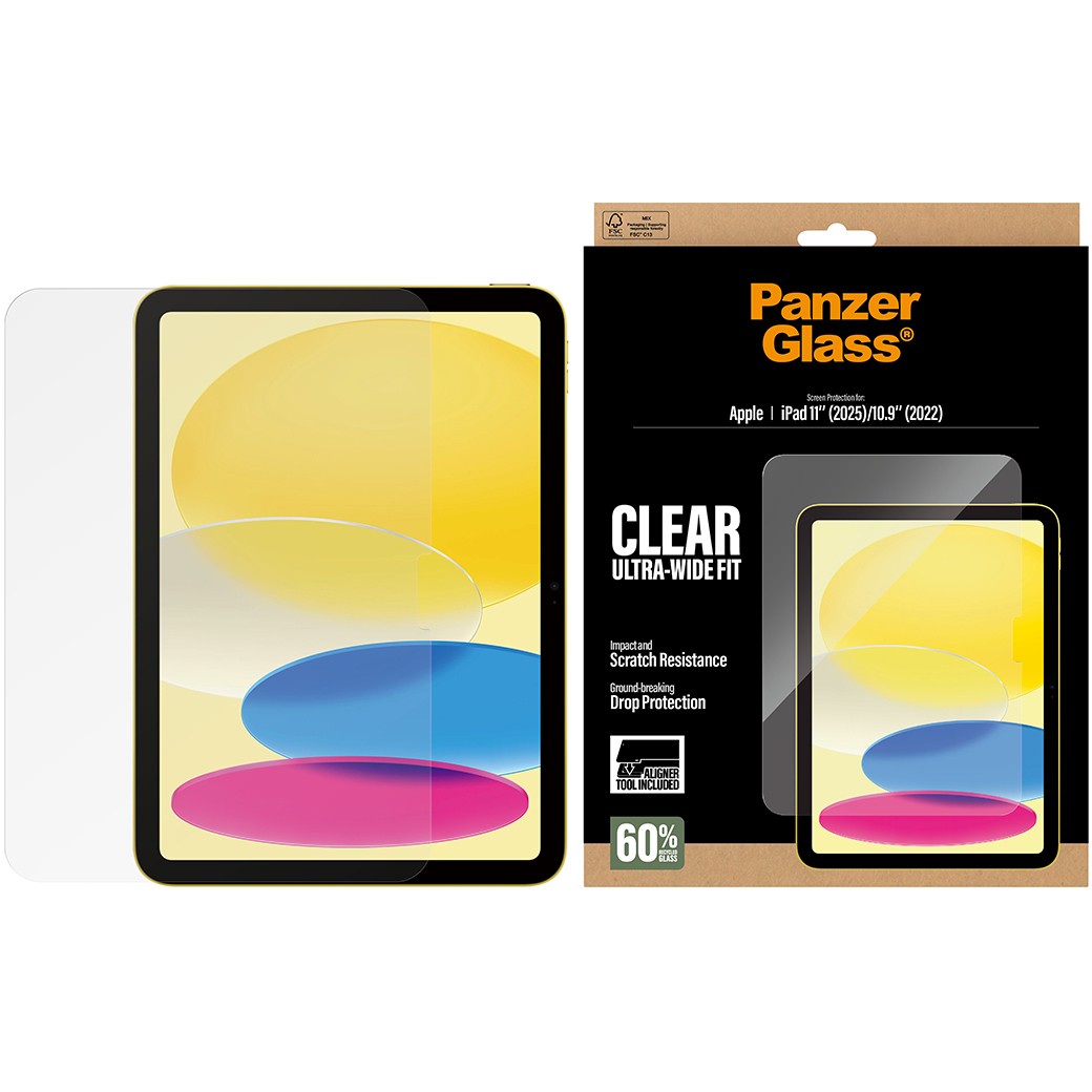 Lernen Sie unseren PanzerGlass® Displayschutz kennen – hergestellt aus 60 % recyceltem Glas. iPads gehören zum Alltag – und damit sind sie auch den täglichen Risiken wie Stürzen, Stößen und Kratzern ausgesetzt. Genau dafür wurde dieser PanzerGlass® Displayschutz entwickelt: um Ihr iPad zuverlässig vor den kleinen Missgeschicken des Lebens zu schützen. Unerwartete Stöße gegen scharfkantige Tischkanten oder Stürze auf steinharte Böden haben keine Chance gegen seine kratz- und stoßfesten Schichten. Mit dem neuen FastFit Tool wird die Installation zum Kinderspiel. Schluss mit schiefem Anbringen oder Staubeinschlüssen. Lege dein iPad einfach mit der Vorderseite nach oben, zieh’ an der Lasche – und genießen eine makellose Montage, jedes Mal. Der Ultra-Wide Fit Displayschutz bedeckt die gesamte Vorderseite deines iPads und sorgt für eine kristallklare Sicht auf den Bildschirm – dabei bleibt genügend Platz für eine Schutzhülle. Geliefert wird er in FSC™-zertifizierter Verpackung, die recycelt werden kann. PanzerGlass® Displayschutz. Einfach anzubringen. Hält stark. Geschätzt von iPad-Nutzern jeden Alters.