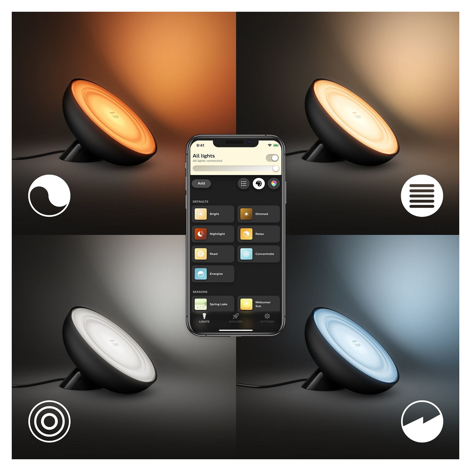 Philips Hue White and Color ambiance Bloom Tischleuchte schwarz. Typ: Intelligente Tischleuchte, Schnittstelle: Bluetooth/Zigbee, Produktfarbe: Schwarz. Unterstützte mobile Betriebssysteme: Android, iOS. Energieeffizienzklasse: G, Energieverbrauch pro 1.000 Stunden: 8 kWh, Eingangsspannung: 220-240 V. Kabellänge: 2 m, Breite: 129 mm, Tiefe: 126 mm. Verpackungsart: Box, Verpackungsbreite: 21,8 mm, Verpackungstiefe: 11,1 mm