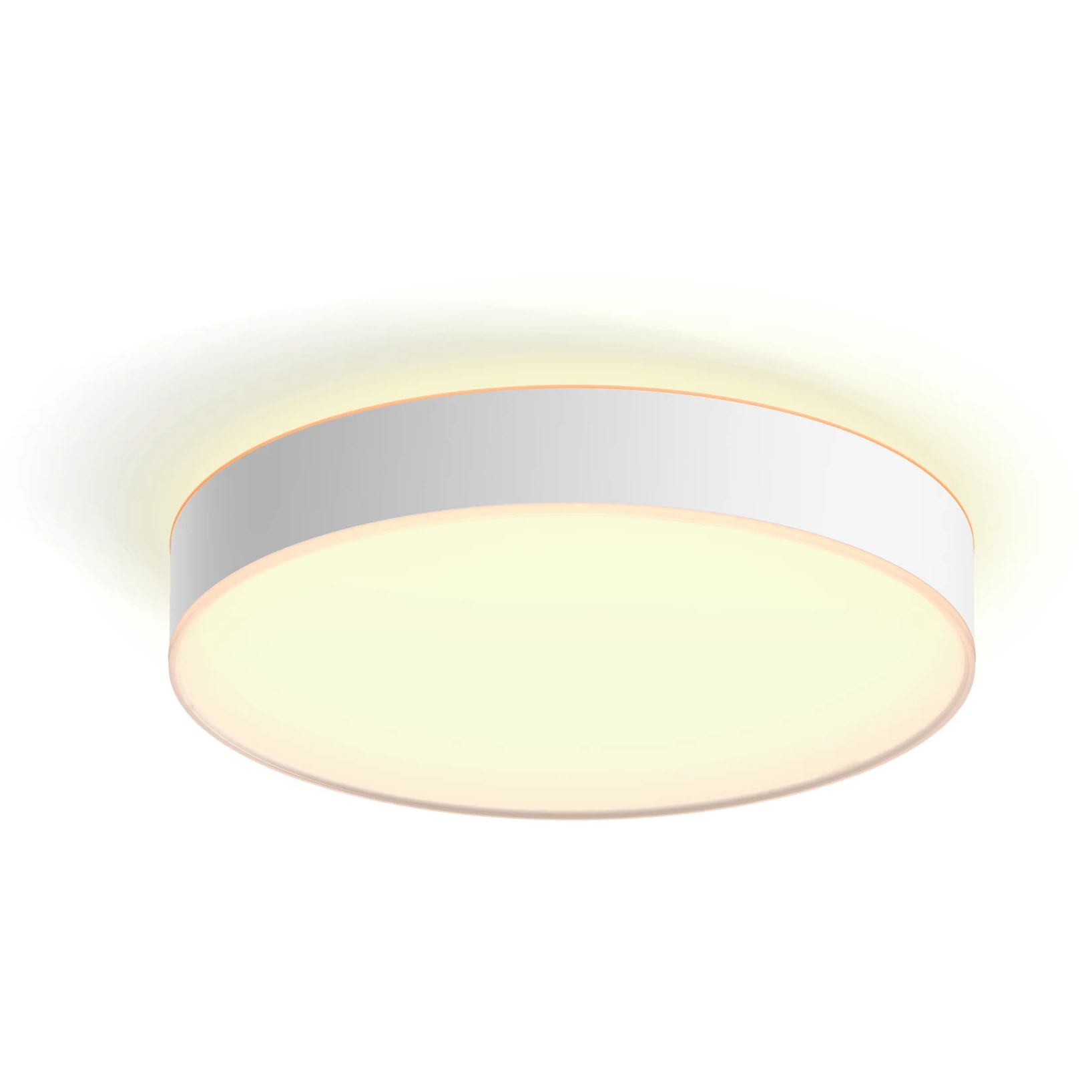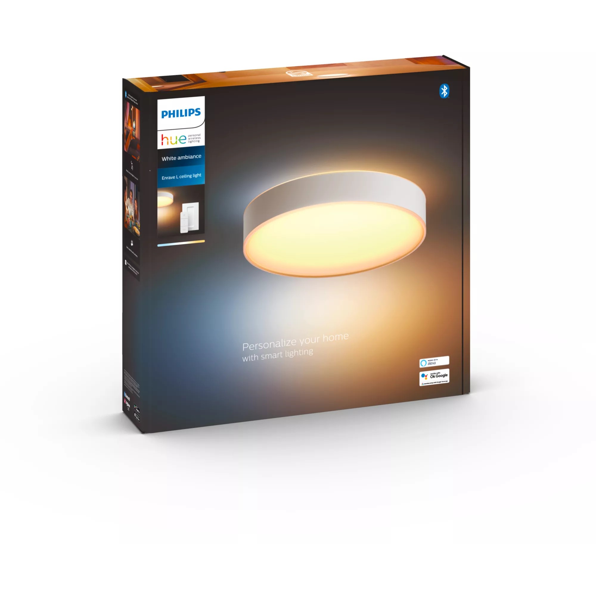 Philips Hue White ambience Enrave Deckenleuchte L weiß + Dimmschalter. Typ: Intelligente Deckenbeleuchtung, Schnittstelle: Bluetooth, Produktfarbe: Weiß. Energieeffizienzklasse: F, Eingangsspannung: 50–60 Hz, Spannung: LED. Breite: 425 mm, Tiefe: 425 mm, Höhe: 86 mm. Verpackungsbreite: 476 mm, Verpackungstiefe: 502 mm, Verpackungshöhe: 100 mm. Menge pro Packung: 1 Stück(e)