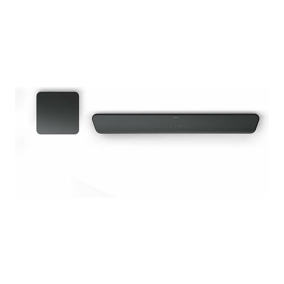 Philips 5300 series TAB5309/10. Audio Kanäle: 2.1 Kanäle, RMS-Leistung: 120 W, Eingebaute Audio-Decoder: DTS 5.1, DTS Virtual:X, Dolby Digital, Dolby Digital Plus. Soundbar Lautsprecher RMS Leistung: 120 W, Impedanz: 8 Ohm, THD, totalklirren: 10%. Subwoofer-Typ: Aktiver Subwoofer, Subwoofer-Konnektivität: Kabellos, Subwoofer Frequenzbereich: 40 - 150 Hz. Produktfarbe: Grau, Name der Farbe: Dark gray, Unterstützte Audioformate: FLAC, LPCM, MP3, WAV. Übertragungstechnik: Verkabelt & Kabellos