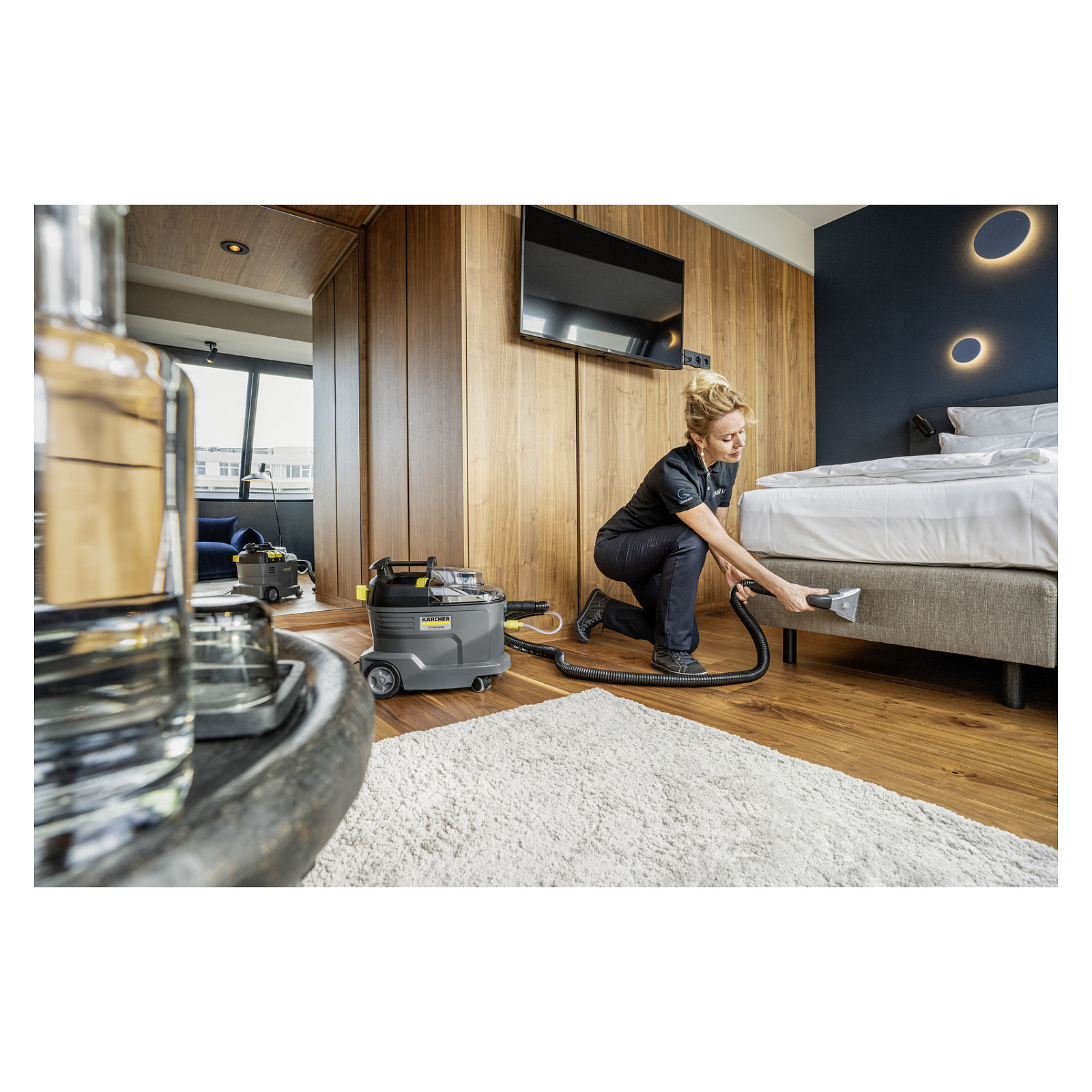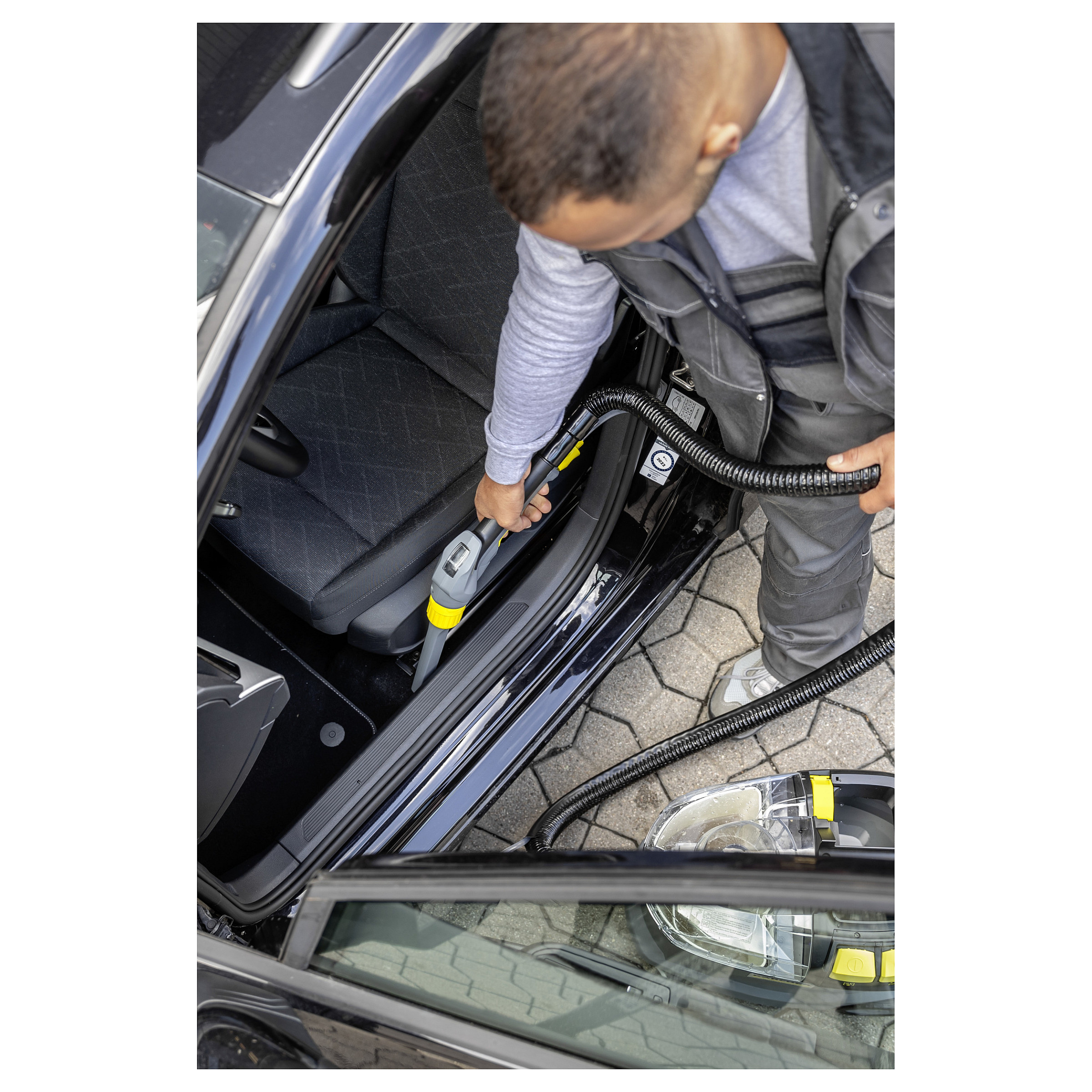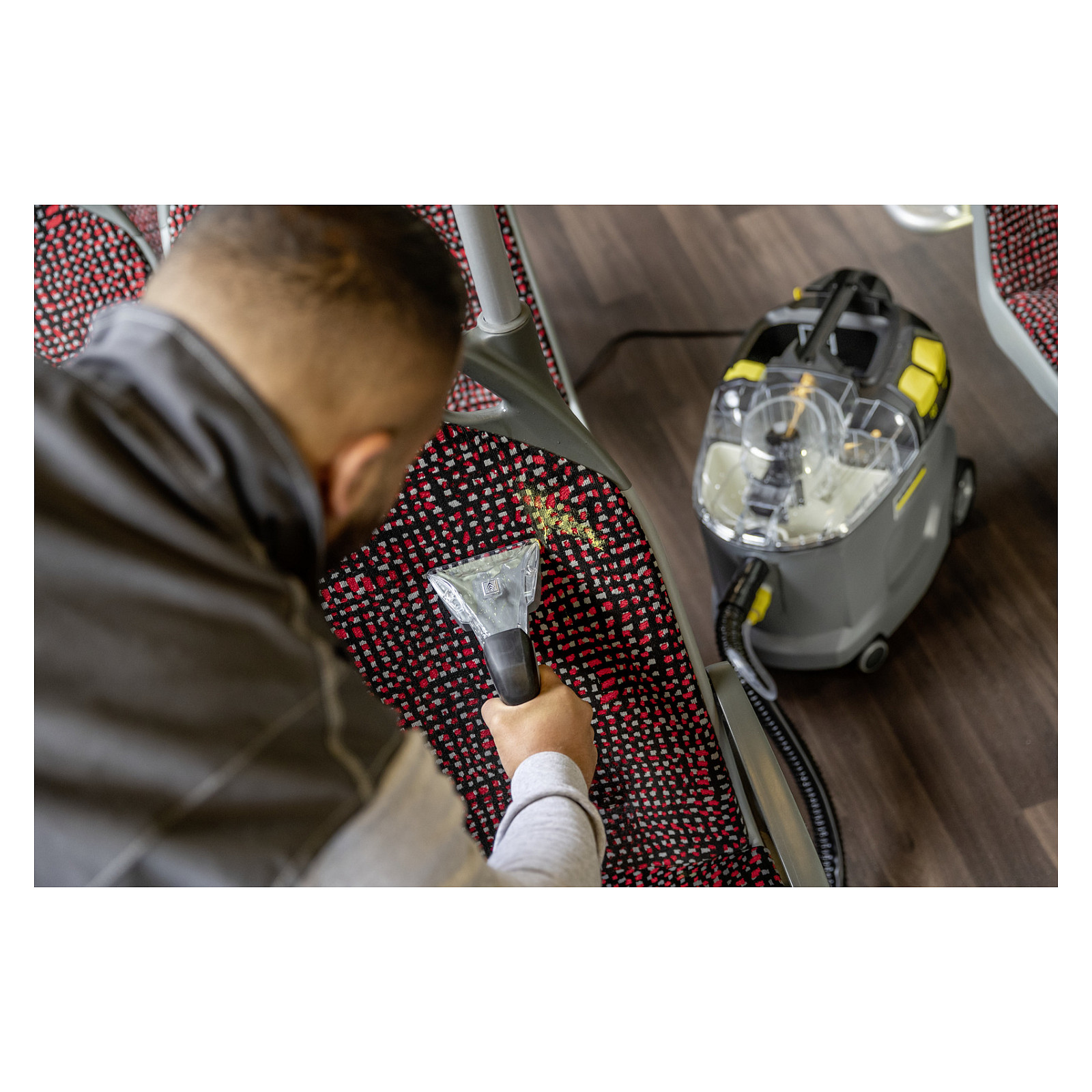 Robust, langlebig, effizient: Der Waschsauger Puzzi 8/1 von Kärcher überzeugt bei der Polsterreinigung und Fleckentfernung auf textilen Flächen mit herausragenden und hygienischen Reinigungsergebnissen und hoher Wirtschaftlichkeit. Dabei sprüht das kompakte Sprühextraktionsgerät die Reinigungslösung tief in die Textilfasern ein und saugt diese anschließend inklusive des gelösten Schmutzes wieder ab. Diese sehr gute Rücksaugleistung sorgt dazu auch für eine schnelle Trocknung und Wiederbegehbarkeit der textilen Flächen – ideal für die hohen Ansprüche von Reinigungsprofis im Hotel- und Gaststättengewerbe oder in der Fahrzeuginnenreinigung. Dazu passt auch die serienmäßige, extra kurze Polsterdüse zur komfortablen, ergonomischen Reinigung von engen Bereichen. Dank seines sehr geringen Gewichts und des ergonomischen Tragegriffs ist der Waschsauger problemlos einhändig zu transportieren. Große, per Hand oder Fuß bedienbare Drucktasten erhöhen dazu den Anwenderkomfort. Zur besseren Sicht auf die Schmutzflotte sind der Gerätedeckel sowie die Handdüse transparent gehalten.
