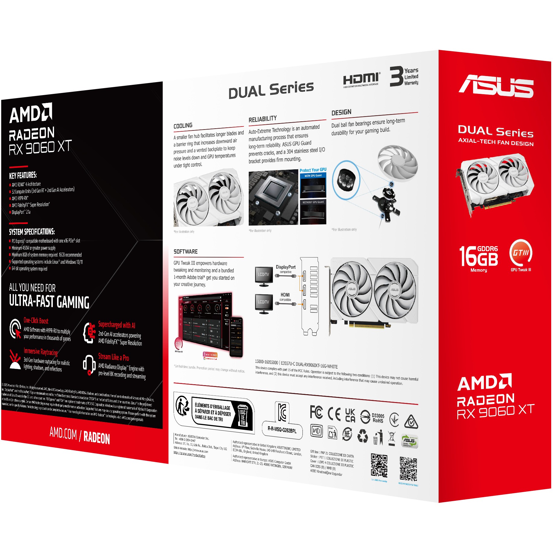 Die ASUS Dual Radeon™ RX 9060 XT White Edition kombiniert starke thermische Leistung mit breiter Kompatibilität. Fortschrittliche Kühllösungen von Flagship-Grafikkarten - darunter zwei Axial-Tech-Lüfter zur Optimierung des Luftstroms zum Kühlkörper. Der kompakte 2,5-Slot-Formfaktor bietet mehr Leistung auf weniger Raum. Diese Verbesserungen machen die ASUS Dual zur perfekten Wahl für Gamer, die eine starke Grafikleistung in einem kompakten Gehäuse suchen.