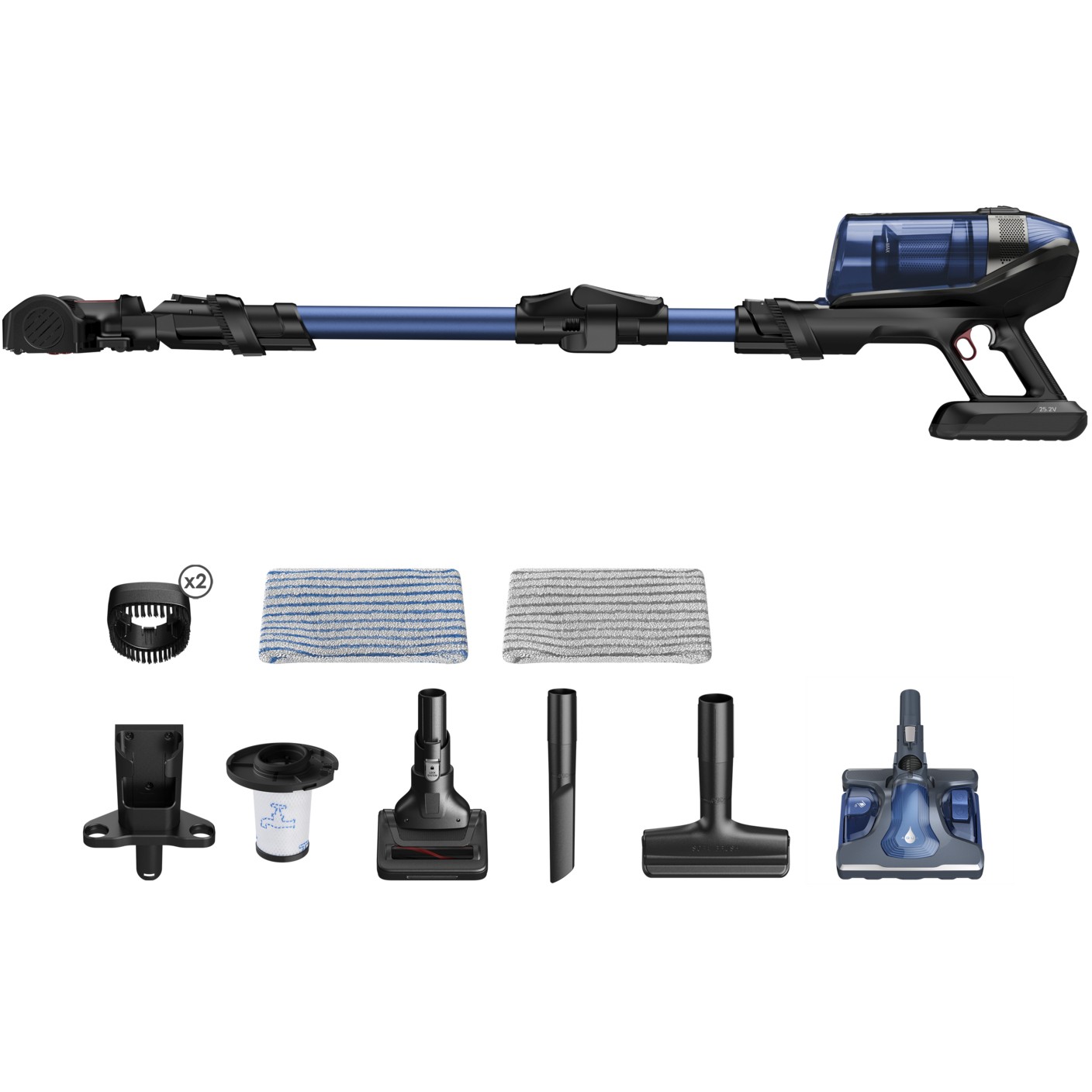 Rowenta RH98C0. Produkttyp: 2-in-1-Stabstaubsauger, Staubbehälter Typ: Beutellos, Produktfarbe: Blau, Grau. Reinigungsart: Trocken&Nass, Schmutztrennungsmethode: Zyklonal, Reinigen der Oberflächen: Glatter Boden, Teppich, Harter Boden, Treppenstufen, Kachel, Polsterung. Energiequelle: Akku, Maximale Eingangsleistung: 320 W, Akku-/Batterietechnologie: Lithium-Ion (Li-Ion). Verpackungsbreite: 228 mm, Verpackungstiefe: 578 mm, Verpackungshöhe: 395 mm. Breite: 120 mm, Tiefe: 1250 mm, Höhe: 255 mm