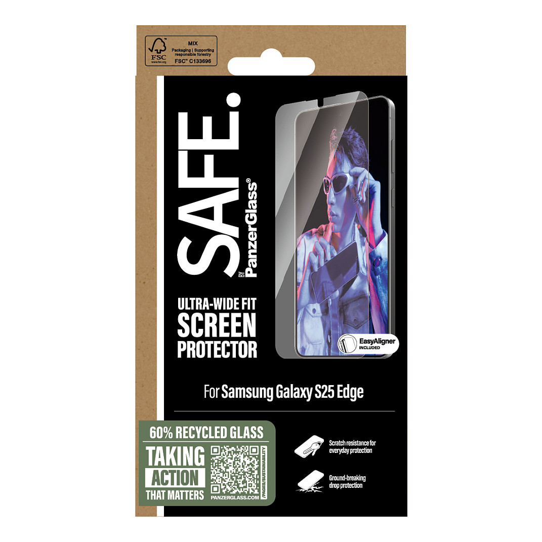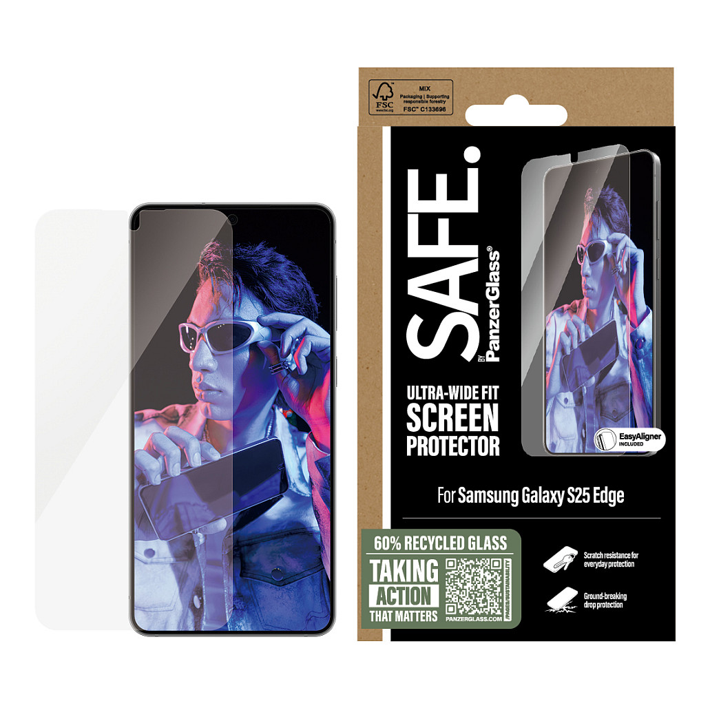 SAFE. ist echt. SAFE. ist für dich. SAFE. ist für Missgeschicke auf der Tanzfläche, für Selfies, die schief gehen, für alltägliches Fummeln, Fallenlassen und Displayschutz. Dieser SAFE. by PanzerGlass® Displayschutz aus 60 % recyceltem Material wirkt wie ein Airbag, der dein Handy vor Stößen und Kratzern schützt, ohne die Funktionalität und das Aussehen deines Geräts zu beeinträchtigen. Er hat sogar eine wischfeste Beschichtung, die Spuren von Fingerabdrücken und Fett reduziert. Kannst du es spüren? Liebe liegt in der Luft. Liebe für Handys und den Planeten. Das ist der neue Kreislauf des Handy-Lebens. Wenn du dein geliebtes Handy SAFE. aufbewahrst, kannst du es eines Tages an einen anderen Handy-Liebhaber weitergeben, der es genauso lieben wird wie du. Entscheide dich für SAFE. und schenke deinem Handy ein zweites, drittes oder viertes Leben! Das ist eine Möglichkeit, auf eine nachhaltigere Zukunft hinzuarbeiten! Eine andere ist die Verwendung nachhaltigerer Verpackungen. Deshalb wird dieses Produkt in einer recycelbaren, FSC®-zertifizierten Verpackung geliefert. Jeder hat es verdient, SAFE zu sein. Ohne Hektik, Bürokratie oder unnötige Komplexität. Dieser Displayschutz wird mit einem EasyAligner geliefert, der die Installation zum Kinderspiel macht (im Ernst!). Um ihn noch einfacher zu machen, haben wir eine Schritt-für-Schritt-Anleitung und einen QR-Code für den schnellen Zugriff auf unser Online-Anleitungsvideo beigefügt. Und denk daran: Du musst den Displayschutz nur einmal anbringen! Dann musst du nie wieder befürchten, dass dein Handy mit dem Displayschutz auf den Boden fällt. Das wird vielleicht nicht passieren, aber wenn doch, wirst du bereuen, dass du nicht auf "In den Warenkorb" geklickt hast. Kein Displayschutz ist eine schlechte Leistung des Displays wert! Das bedeutet, dass er die gesamte Vorderseite deines Handys abdeckt und so einen kristallklaren Blick auf den Displayschutz ermöglicht. Er lässt an den Rändern sogar noch ein wenig Platz für eine Hülle von CARE™ by PanzerGlass®. Und wenn du besonders SAFE. sein willst, kombiniere Displayschutz und Hülle mit einem SAFE. by PanzerGlass® Kameraschutz. Keep your phone SAFE.