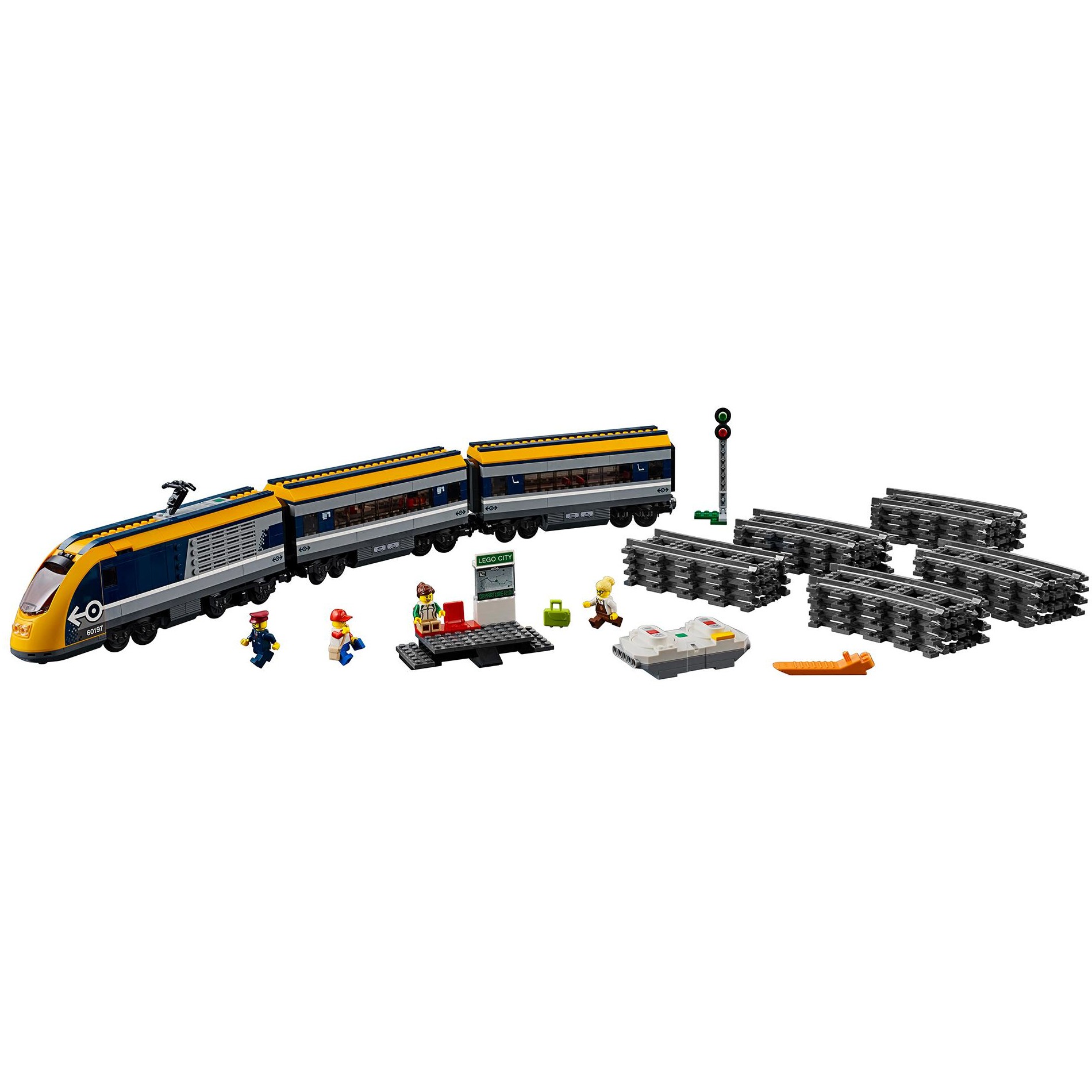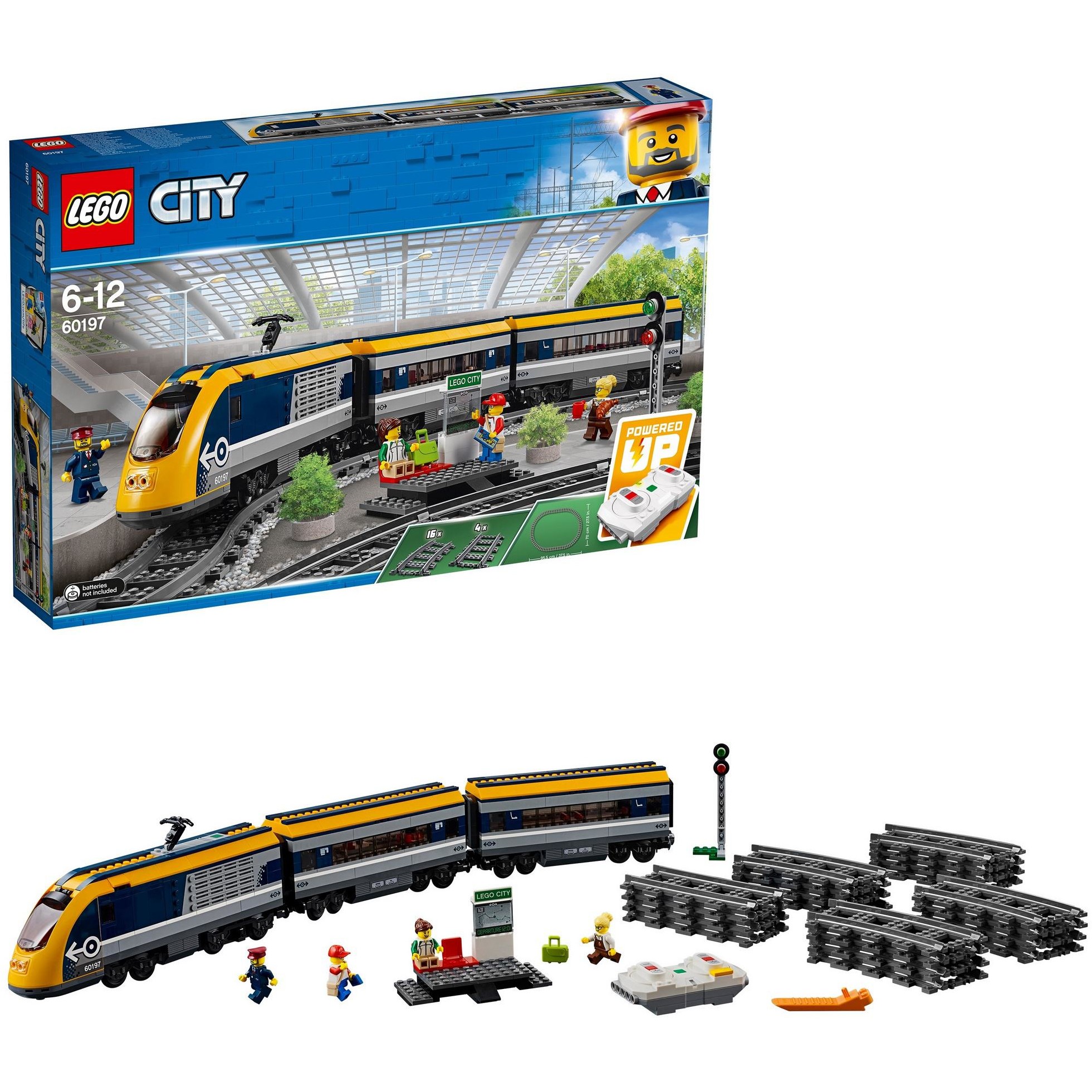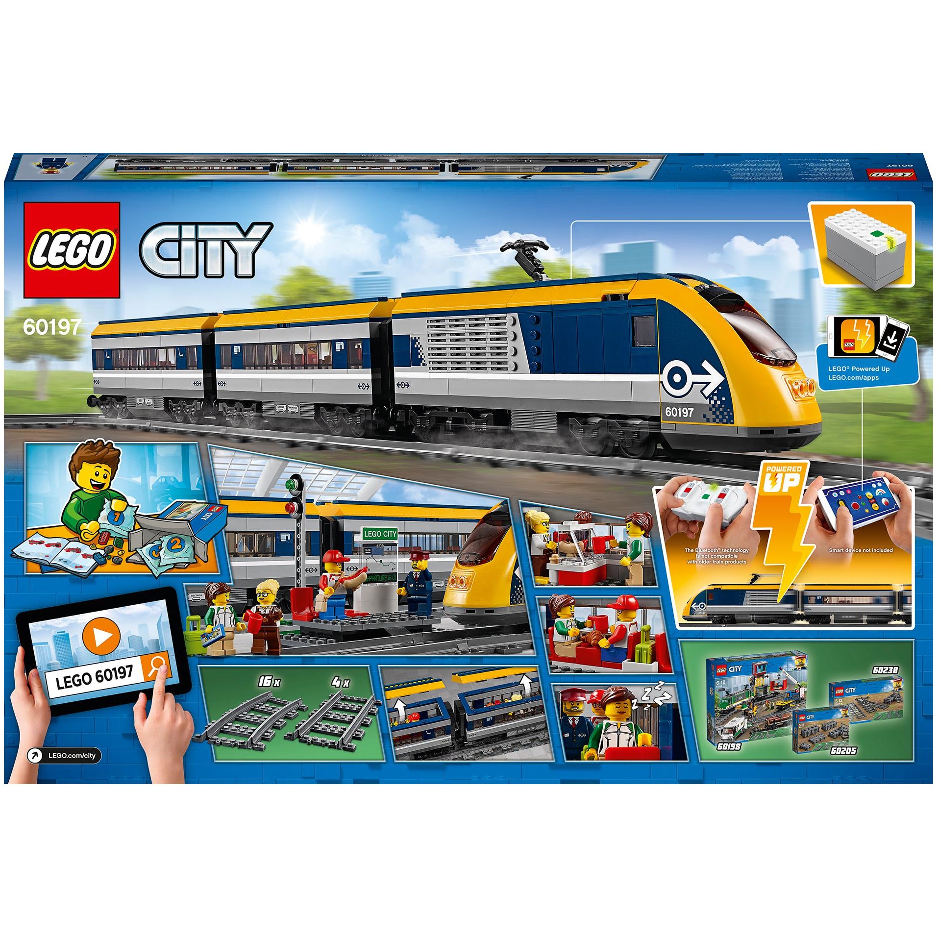 Steig in den LEGO City Personenzug (60197)! Dieses aufregende Set enthält eine motorisierte Lok mit Bluetooth-Fernsteuerung (10 Geschwindigkeitsstufen), aufklappbarer Spitze und Lokführerkabine mit aufklappbarem Fenster, 2 Waggons mit abnehmbaren Dächern, Sitzen und Tischen, eine Rundstrecke aus 16 gekrümmten und 4 geraden Schienensegmenten sowie einen baubaren Bahnsteig mit 2 Sitzen und Streckenplan, ein Zugsignal und 4 LEGO Minifiguren.