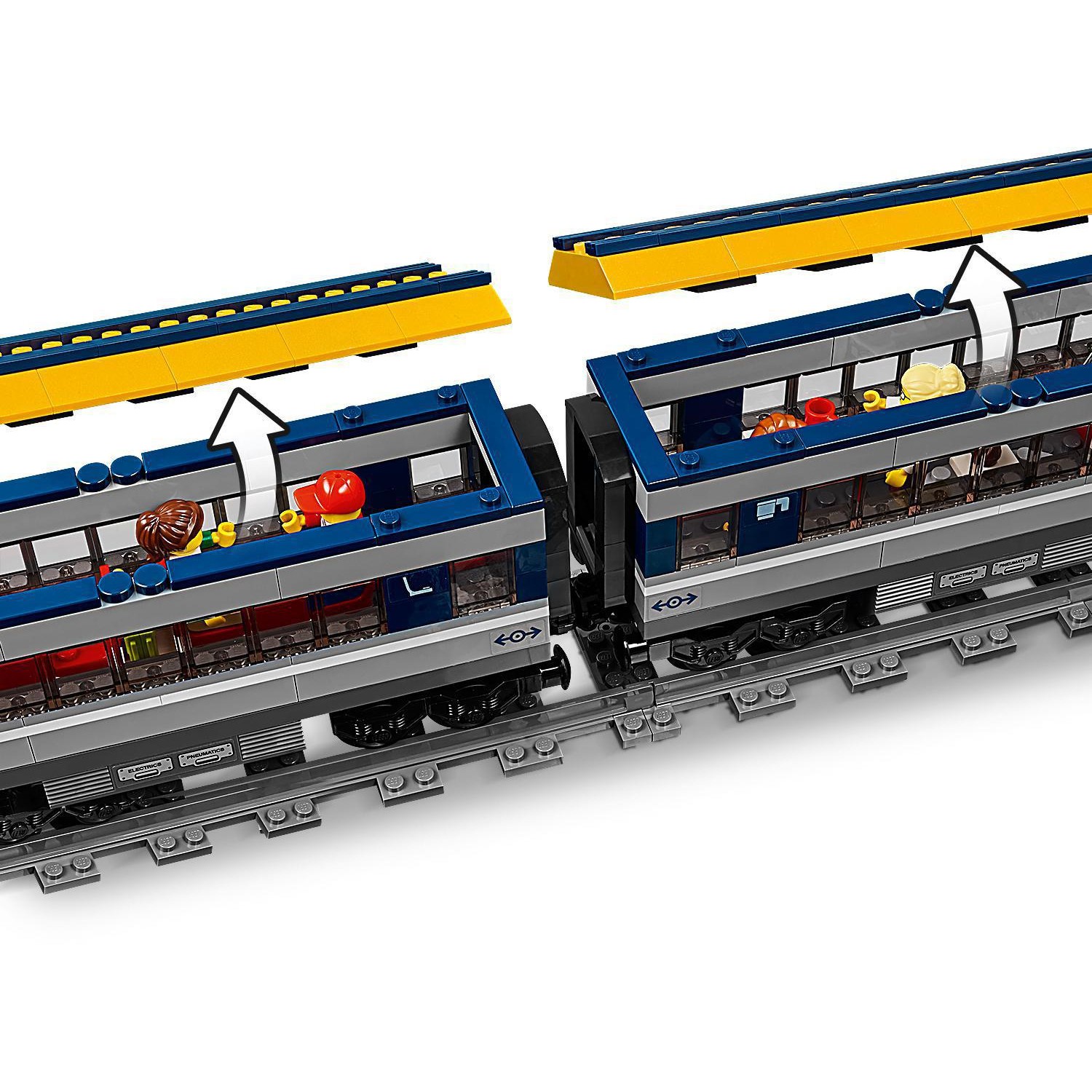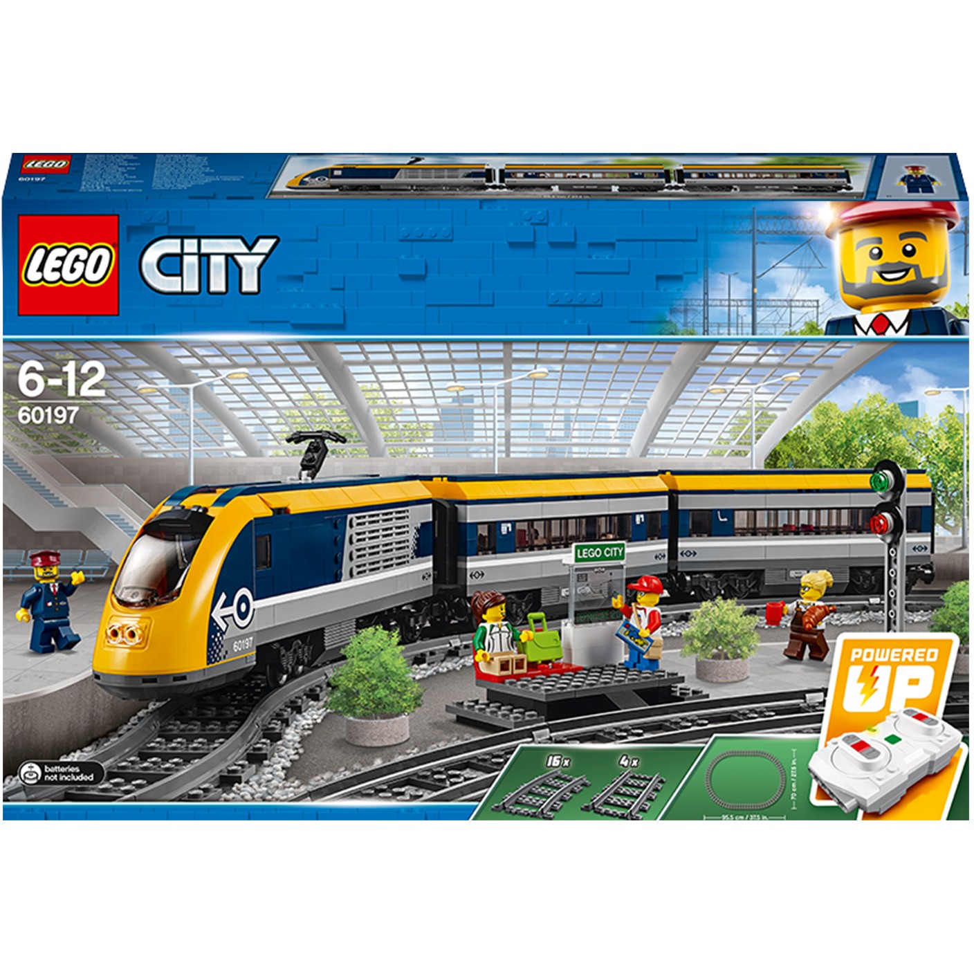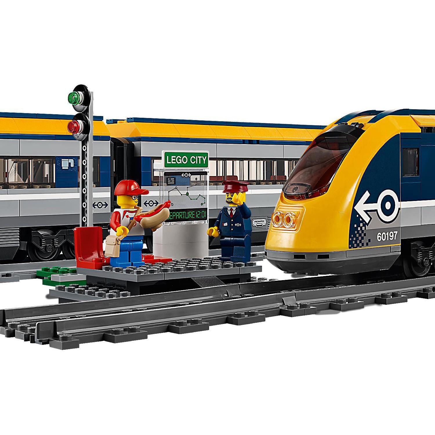 Steig in den LEGO City Personenzug (60197)! Dieses aufregende Set enthält eine motorisierte Lok mit Bluetooth-Fernsteuerung (10 Geschwindigkeitsstufen), aufklappbarer Spitze und Lokführerkabine mit aufklappbarem Fenster, 2 Waggons mit abnehmbaren Dächern, Sitzen und Tischen, eine Rundstrecke aus 16 gekrümmten und 4 geraden Schienensegmenten sowie einen baubaren Bahnsteig mit 2 Sitzen und Streckenplan, ein Zugsignal und 4 LEGO Minifiguren.