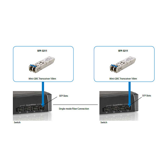 Der LevelOne SFP-3211 ist ein leistungsstarker und kostengünstiger Single-Mode SFP-Transceiver. Für die Verwendung mit Gigabit-Ethernet bietet er bis zu 1.25Gbps bidirektionale Datenübertragungsrate auf einem Single Duplex-Glasfaserkern. Bei Einsatz mit 9 Mikrometer Glasfaserkabel kann eine Distanz von bis zu 10km erreicht werden. Der SFP-3211 Transceiver arbeitet mit einer Wellenlänge von 1310nm mit einer FP-Laserdioden-Lichtquelle und verfügt über einen LC-Anschluss.