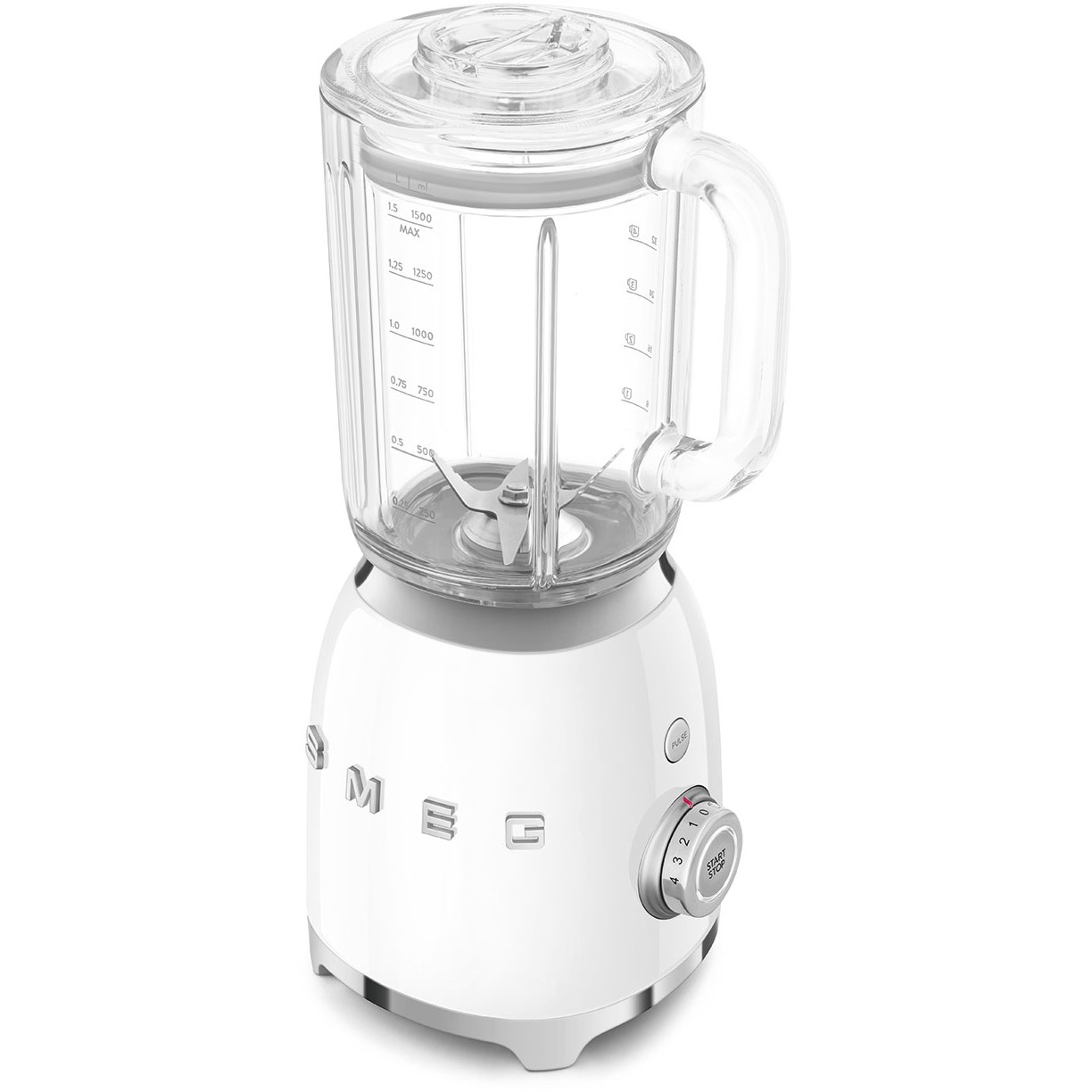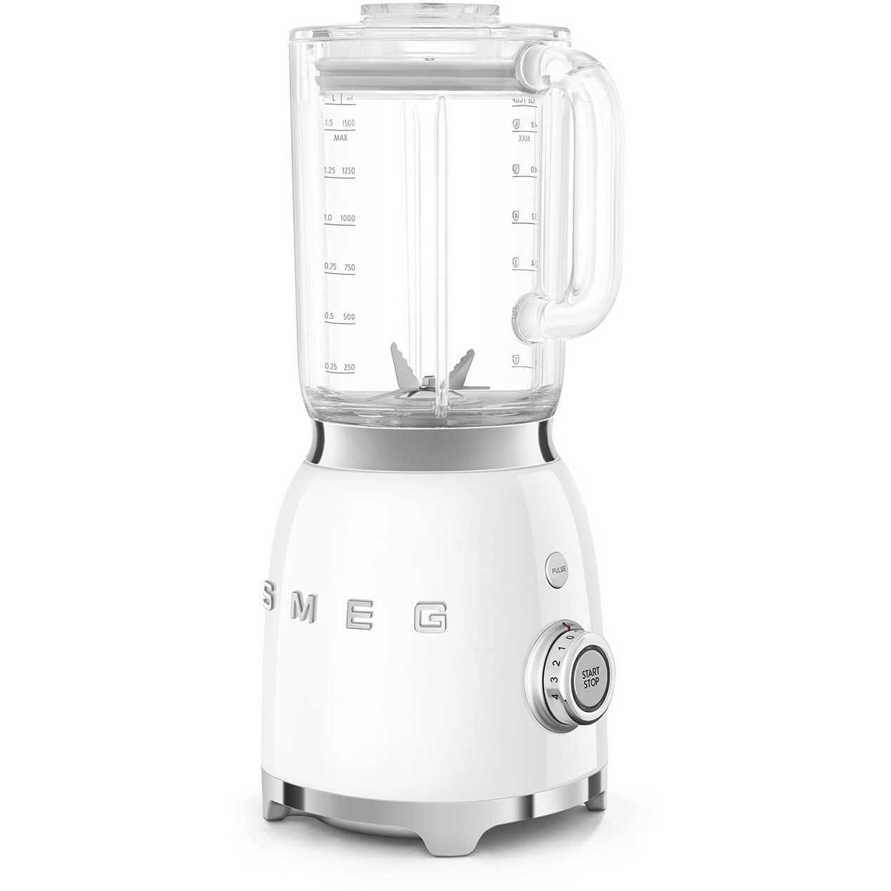 Smeg BLF03WHEU. Typ: Tischplatten-Mixer, Produktfarbe: Weiß, Kabellänge: 1 m. Schüsselkapazität: 1,5 l, Rotationsgeschwindigkeit (min.): 9000 RPM, Rotationsgeschwindigkeit (max.): 18000 RPM. Gehäusematerial: Aluminium, Material Messer: Edelstahl, Material: Aluminium, Edelstahl. Leistung: 800 W, Energiequelle: AC, AC Eingangsspannung: 220-240 V. Breite: 163 mm, Tiefe: 197 mm, Höhe: 397 mm