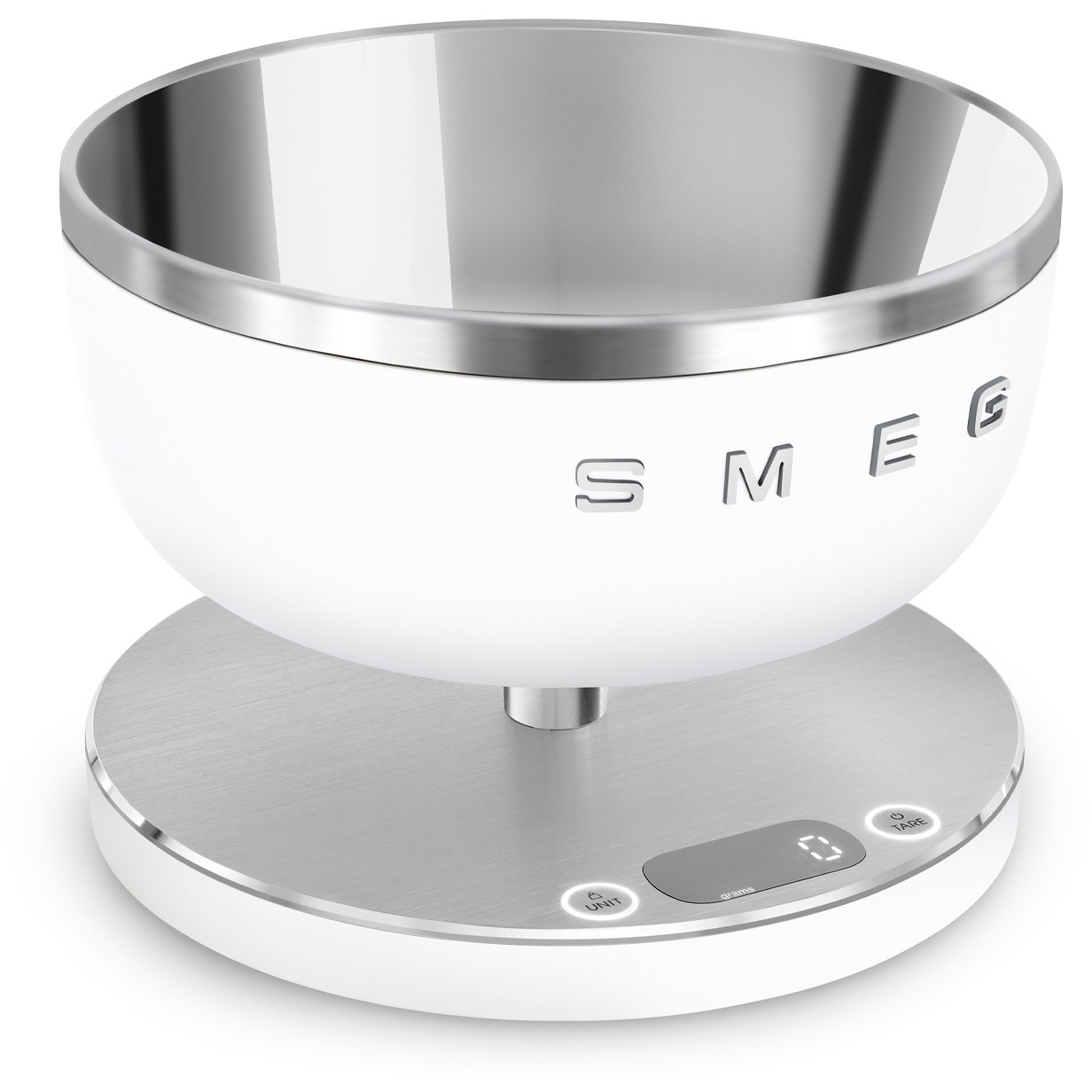 Smeg KSC01WHMWW. Typ: Elektronische Küchenwaage, Höchstgewichtskapazität: 5 kg, Produktfarbe: Edelstahl, Weiß. Display-Typ: LED, Farbe der Hintergrundbeleuchtung: Weiß. Akku-/Batterietyp: Integrierte Batterie, Akku-/Batterietechnologie: Lithium-Ion (Li-Ion). Breite: 205 mm, Tiefe: 205 mm, Höhe: 150 mm. Verpackungsbreite: 276 mm, Verpackungstiefe: 265 mm, Verpackungshöhe: 226 mm