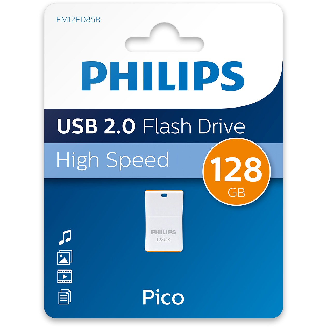 Philips Pico. Kapazität: 128 GB, Geräteschnittstelle: USB Typ-A, USB-Version: 2.0, Lesegeschwindigkeit: 30 MB/s, Schreibgeschwindigkeit: 20 MB/s. Formfaktor: Kappe, Produktfarbe: Orange, Weiß