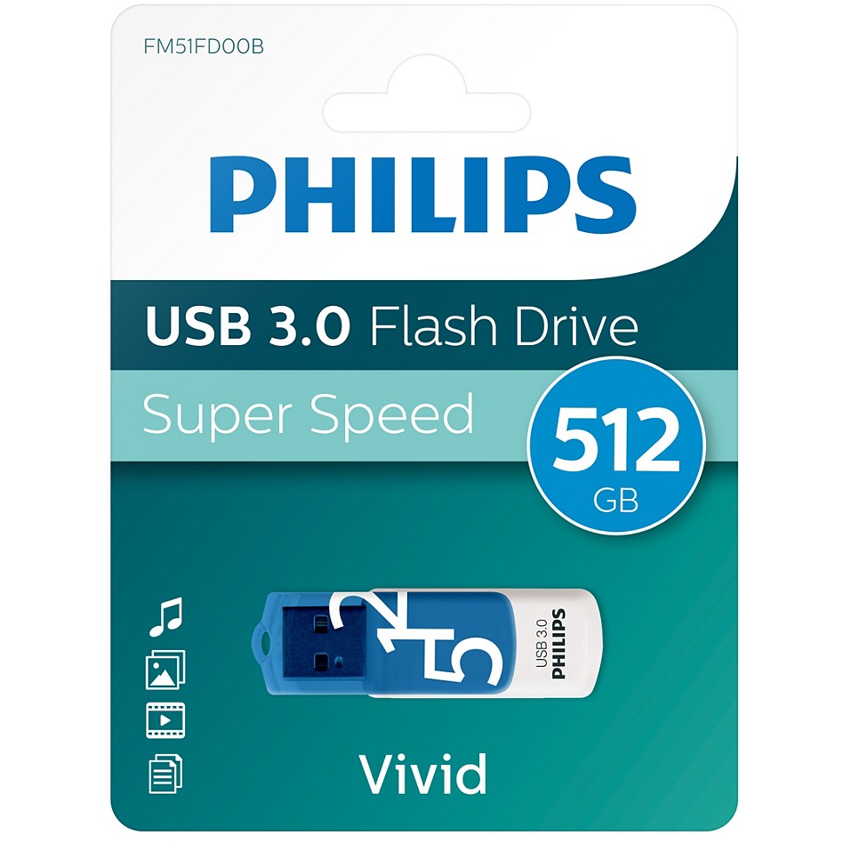 Philips FM51FD001B/00. Kapazität: 51 GB, Geräteschnittstelle: USB Typ-A, USB-Version: 3.2 Gen 1 (3.1 Gen 1). Formfaktor: Kappe, Produktfarbe: Blau, Weiß