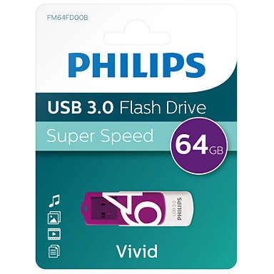 Philips FM64FD00B. Kapazität: 64 GB, Geräteschnittstelle: USB Typ-A, USB-Version: 3.2 Gen 1 (3.1 Gen 1). Formfaktor: Drehring. Gewicht: 8 g. Produktfarbe: Violett, Weiß