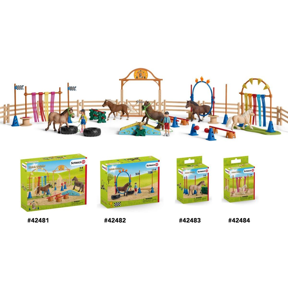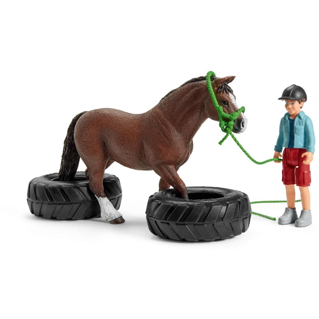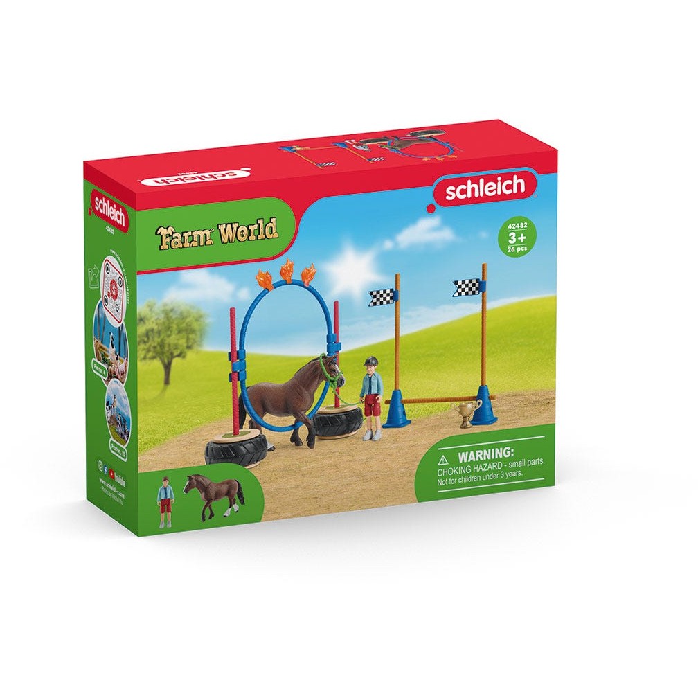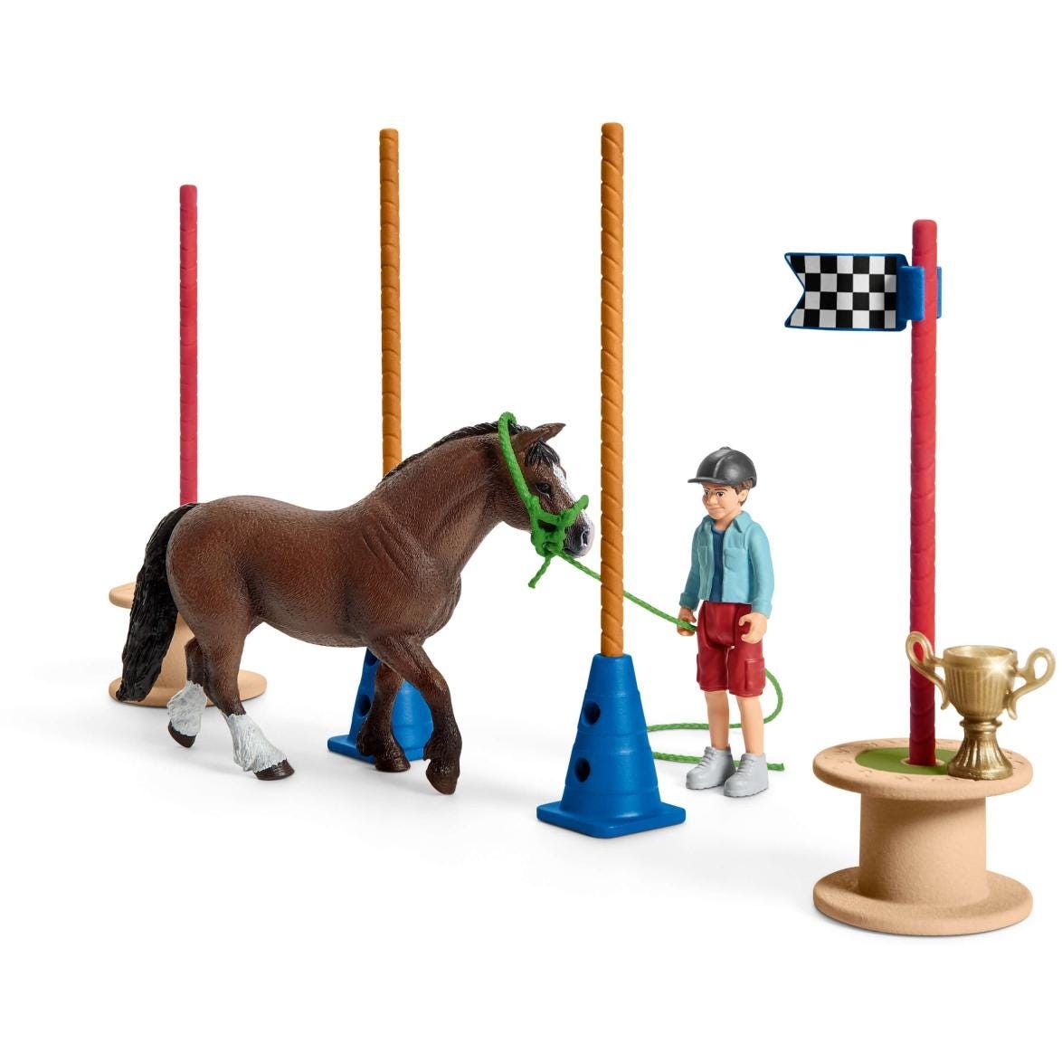 1x Welsh Pony, 1x Junge, 1x Reithelm, 1x Zaumzeug, 1x Führstrick, 1x Pokal, 2x Kegel, 5x Stange, 1x Ring-Sprunghindernis, 3x Flamme, 2x Reifen, 2x Flagge Start-Ziel, 1x Stickerbogen