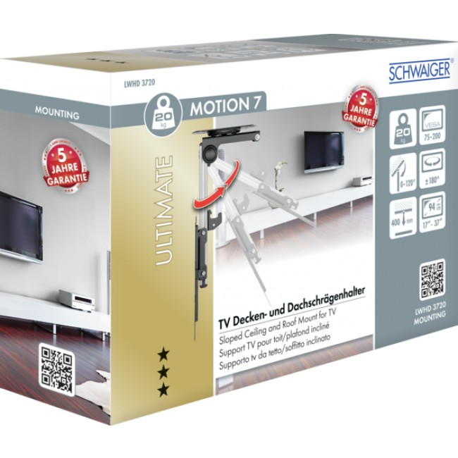 Der SCHWAIGER® TV Decken- und Dach-schrägenhalter ist für die Befestigung von einem Flachbildschirm konzipiert. Der Wandhalter ist nach vorn neigbar, axial drehbar und nach rechts oder links schwenkbar. Die Gelenke können einfach in der Festigkeit verstellt werden. Durch den integrierten Klappmechanismus ist der Wandhalter zudem hervorragend zur Schrankunterbaumontage geeignet, da er bei Bedarf jederzeit platzsparend eingeklappt werden kann, sodass kein Raum dauerhaft verloren geht.