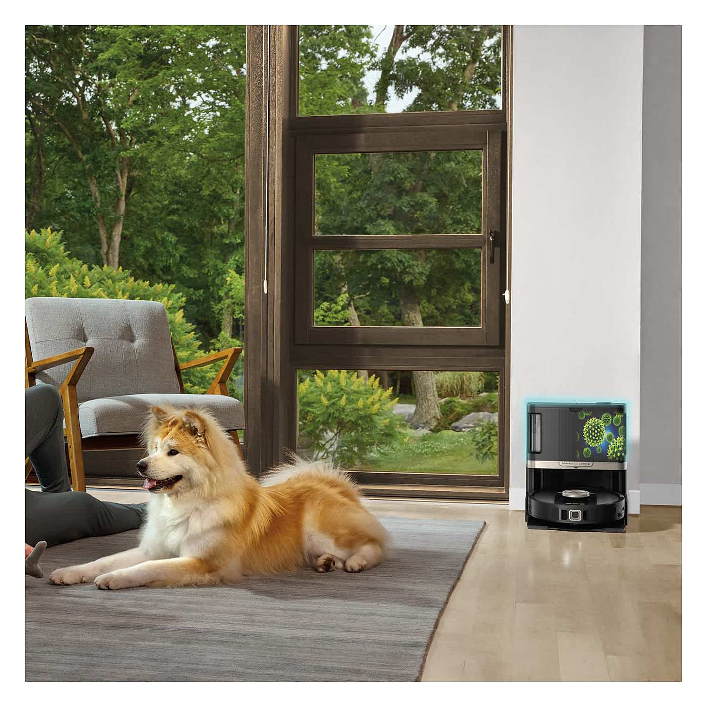 Selbstentleerung: Nach jeder Reinigung kehrt der Roboter zur Basisstation zurück und entleert seinen integrierten Staubbehälter in die beutellose Basisstation. Diese fängt Schmutz bis zu 60 Tage lang auf, so dass Ihr Roboter die tägliche Reinigung ohne ständiges Entleeren bewältigen kann.