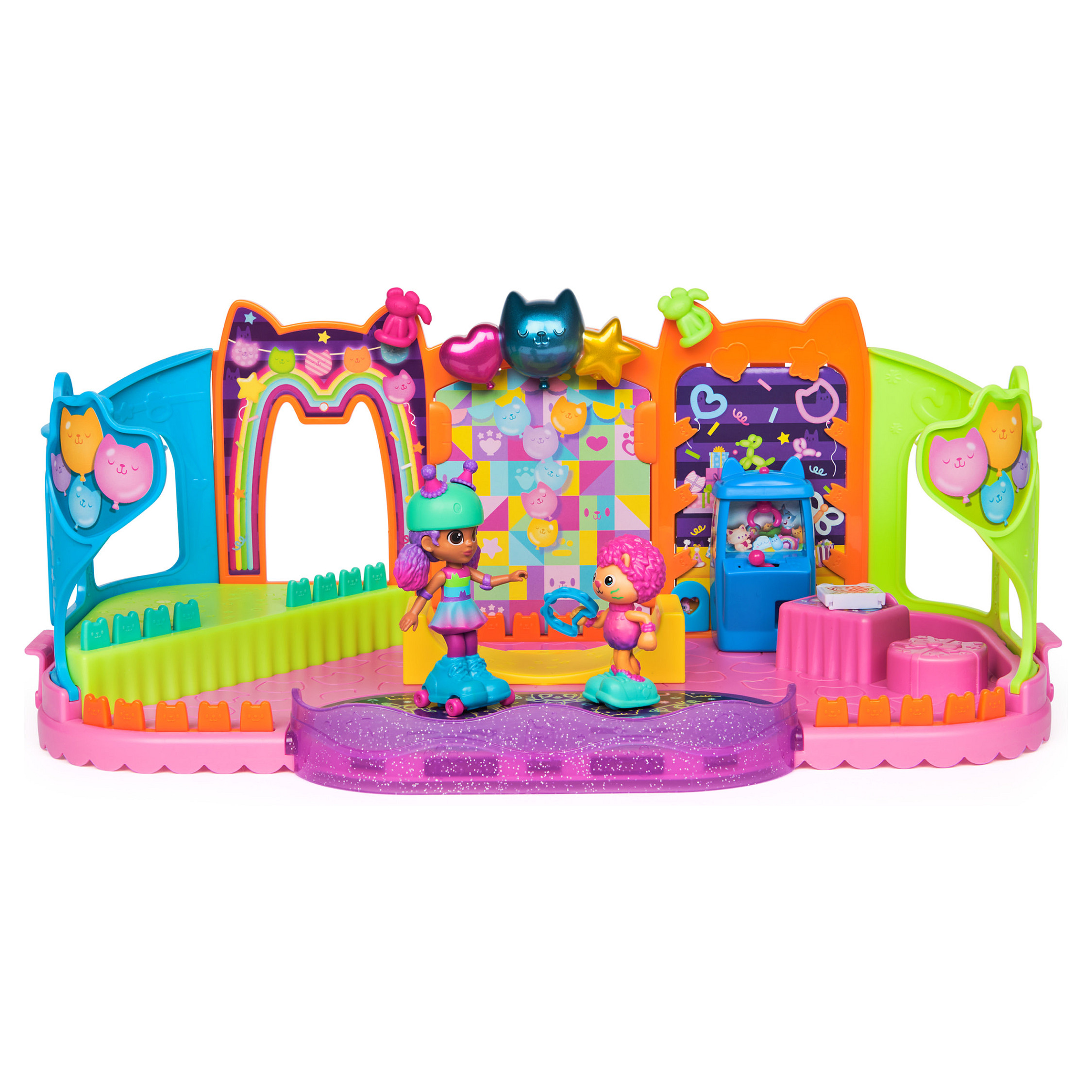 Mit dem Partyzimmer-Spielset können Kinder in die magische Welt der beliebten Animationsserie Gabby's Dollhouse eintauchen und ihre Lieblingsszenen nachspielen. Dieses Set enthält eine besondere Gabby-Figur sowie exklusiv auch Marty, die Partykatze als Spielzeugfiguren, beide kommen mit funktionierenden Rollschuhen. Das Partyzimmer kann mit den enthaltenen Zubehörteilen und Möbeln dekoriert werden, um es in eine Skate-Park Party mit Rampe und Bühne, sowie Greifautomaten-Station und vielem mehr zu verwandeln. Für noch mehr Spaß lässt sich das Partyzimmer auf Gabbys Purrfect Puppenhaus (separat erhältlich) als Dachgeschoss befestigen, sodass das Puppenhaus bis zu 4 Stockwerken hoch wird und man mit dem Katzen-Aufzug in das Partyzimmer im obersten Stockwerk gelangt. Achtung: der Partyraum passt nicht auf die Movie Puppenhäuser (separat erhältlich). Gabby's Dollhouse-Spielzeug ist das ideale Geschenk für Kinder, die Fans der beliebten Netflix-Serie sind und gerne Puppenhauswelten nachbauen. Mit einer Auswahl aus liebenswerten Katzenfiguren, Zubehörteilen und Puppenhausmöbeln können Kinder ab 3 Jahren ihre ganz eigene Gabby's Dollouse Welt zuhause lebendig werden lassen. Von Spin Master gibt es viele weitere Gabby's Dollhouse Spielzeuge, wie die Balkon Spielset, die an die Fenster der Puppenhauses eingehängt werden können oder niedliche Deluxe Räume (alles separat erhältlich), die ebenfalls in das Puppenhaus eingeschoben werden können und die Spielwelt erweitern.