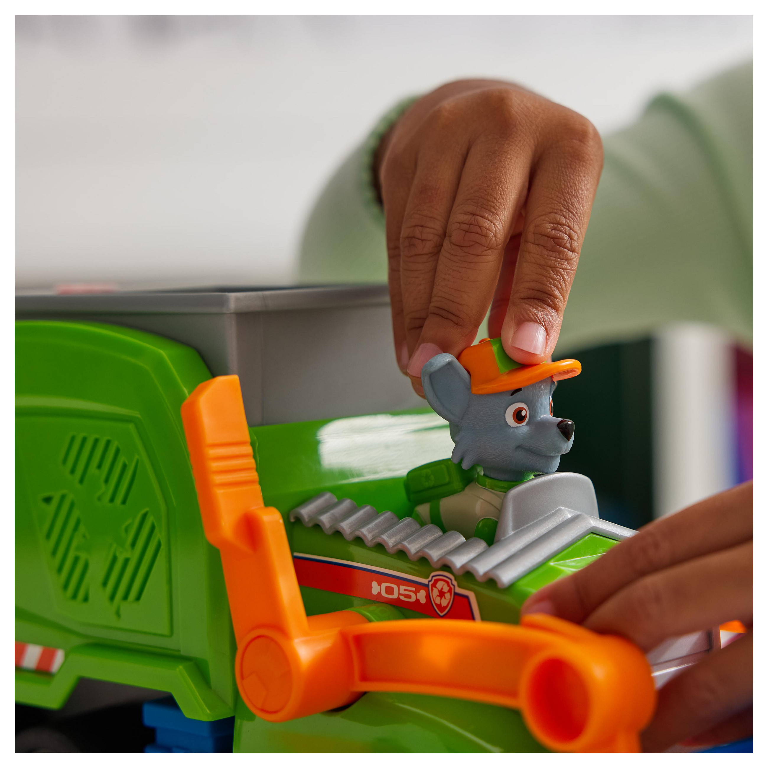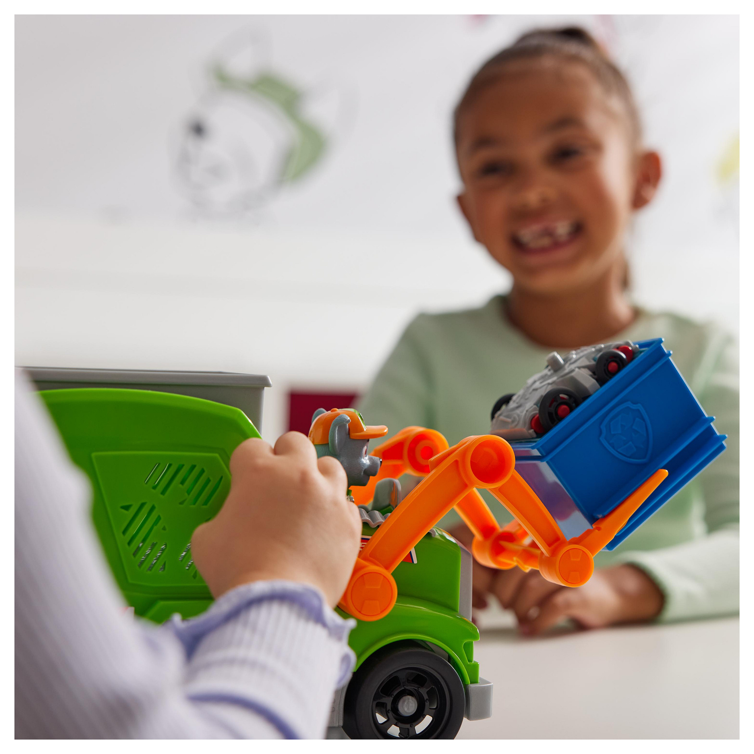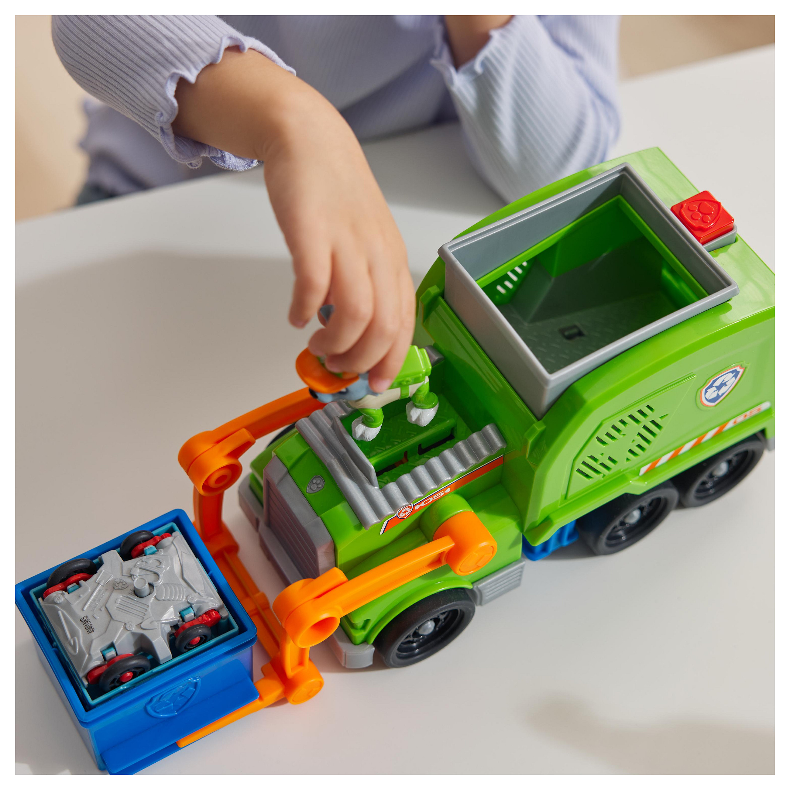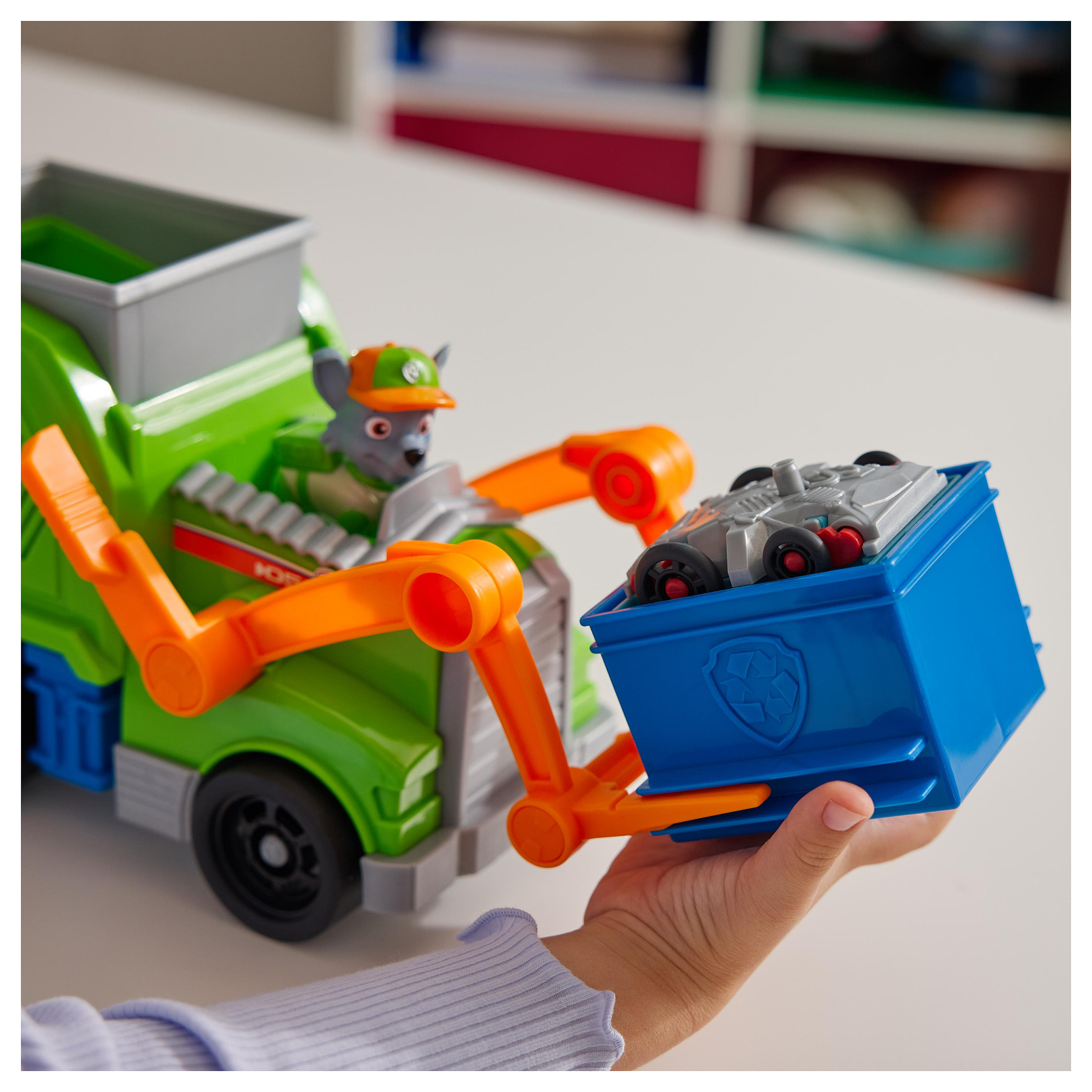 Rocky, der Recyclingspezialist aus der beliebten TV-Serie PAW Patrol, stellt sich mit seinem Deluxe-Recycling Truck aus den YouTube Episoden "Rocky´s Garage" den wirklich kniffligen Aufgaben. Mit authentischen Details, funktionierenden Rädern und tollen Spezial-Funktionen ist Rockys Deluxe-Fahrzeug bereit für spannende Abenteuer. Über eine Gabel am Fahrzeug kann mit einer Tonne Müll ins Fahrzeug verladen, abtransportiert und ausgeladen werden. Aber das Beste kommt erst noch: die Ladung wird im Truck in ein kleines Fahrzeug verwandelt, das Rocky fahren kann! Die mitgelieferte Rocky-Figur ist ca. 7 cm groß (Maßstab der klassischen Hero Pups Figuren) und kann im Fahrersitz des Deluxe Fahrzeugs befestigt werden. Das Spiel mit Rocky und seinem Recycling-Truck regt die kindliche Fantasie zu Rettungsmissionen an, die sich um Freundschaft, Teamwork und Mut drehen. Zusammen mit den anderen Welpen und ihren Rettungsfahrzeugen (jeweils separat erhältlich) kann Rocky die Welt in der Abenteuerbucht in wuffigen Team-Abenteuern noch besser retten!