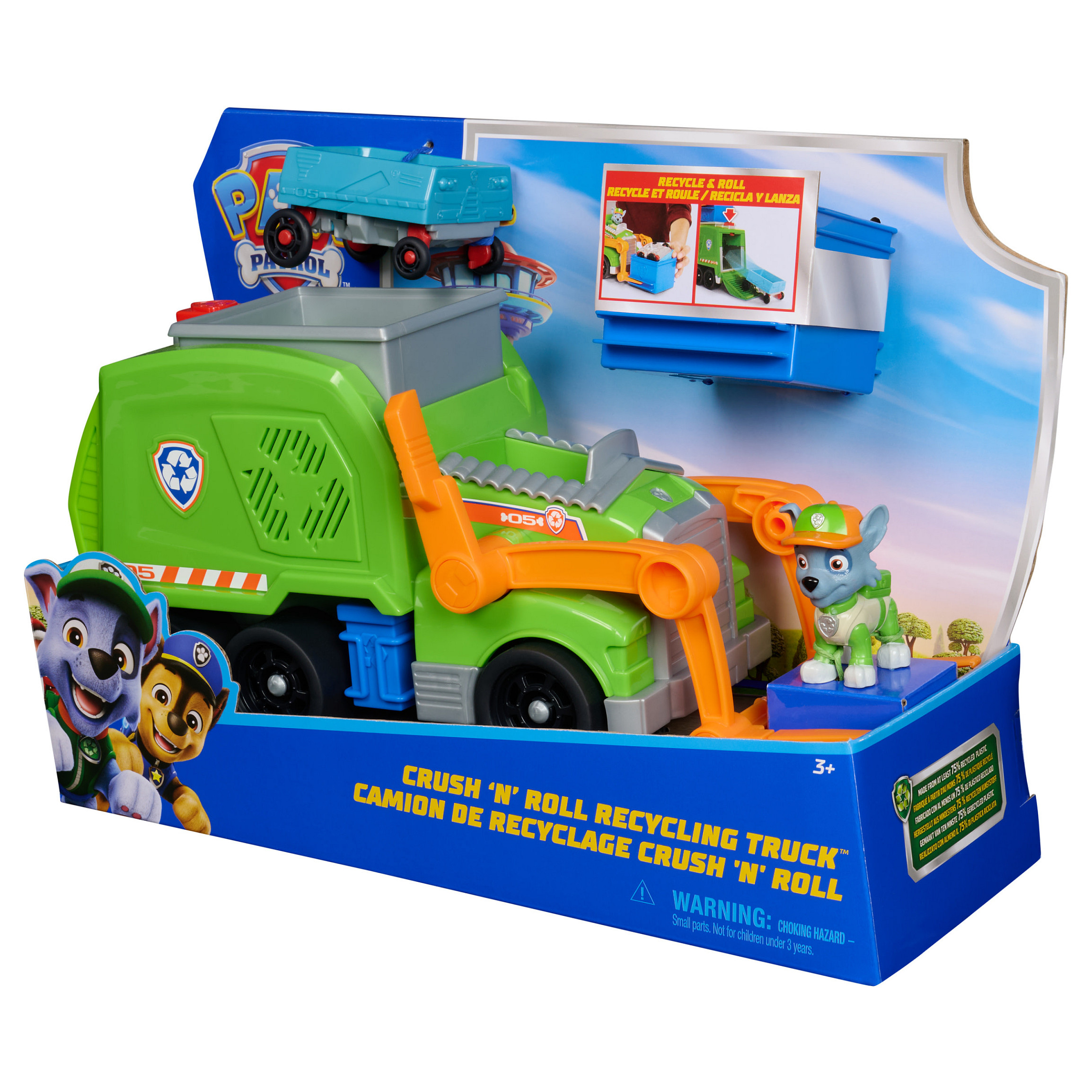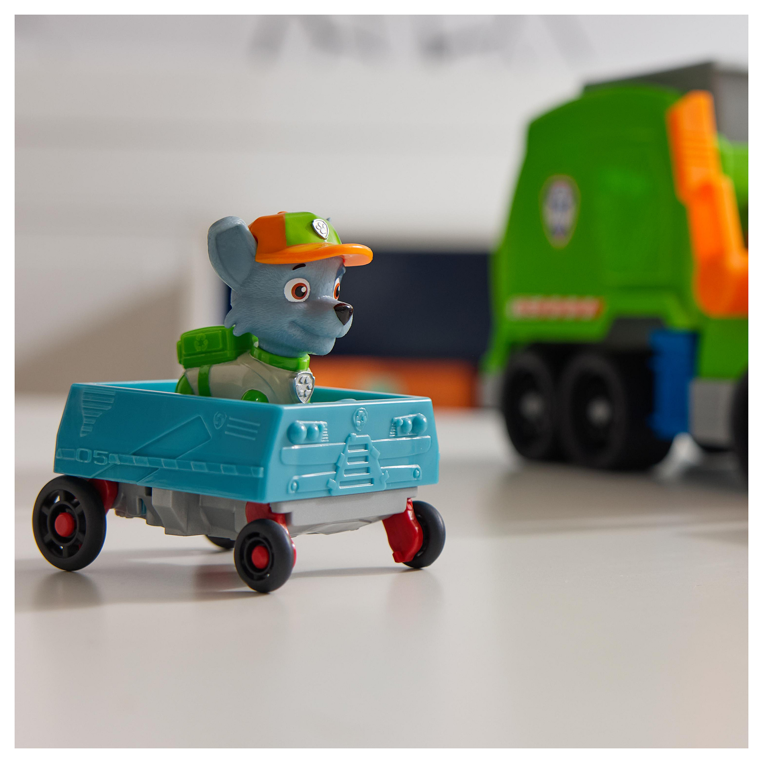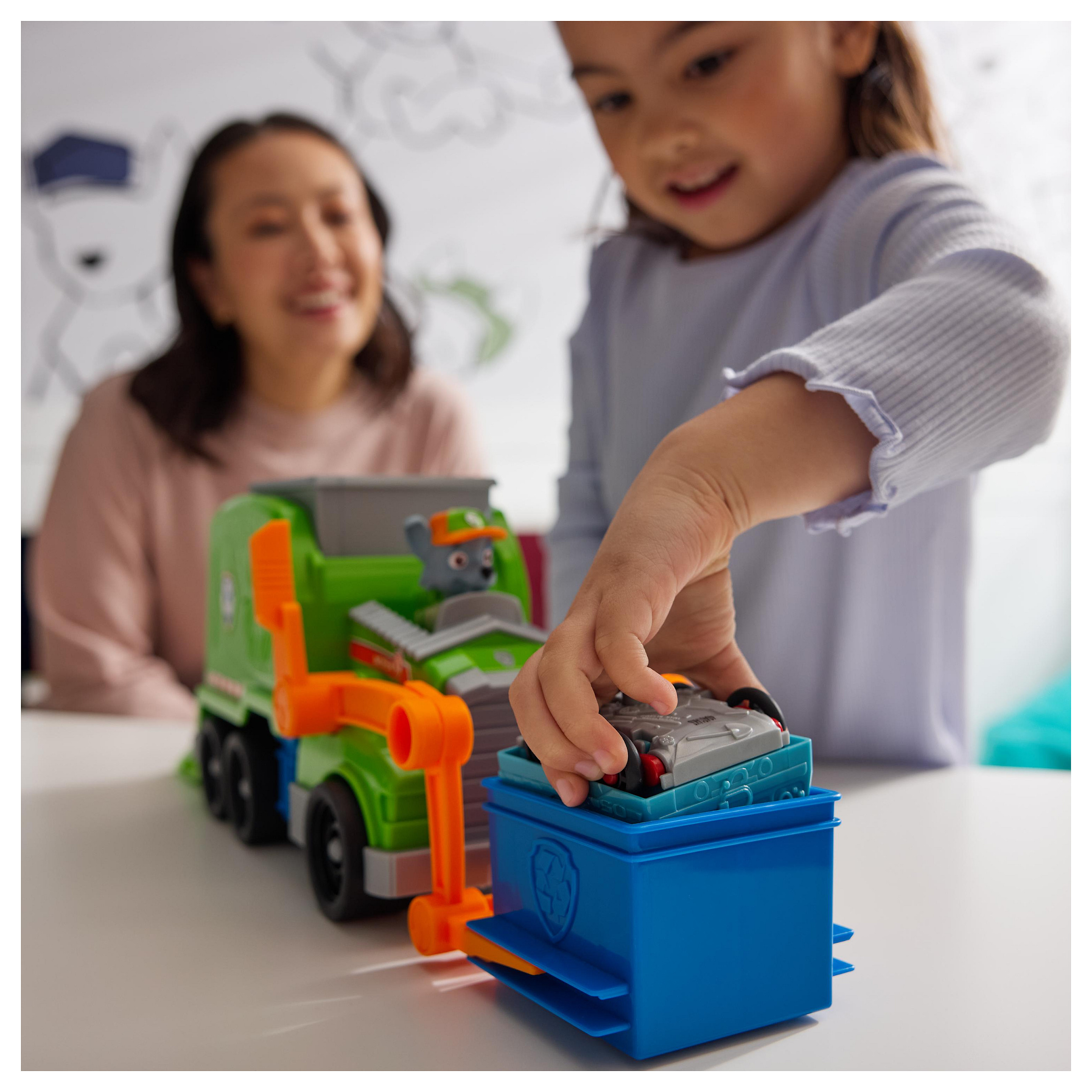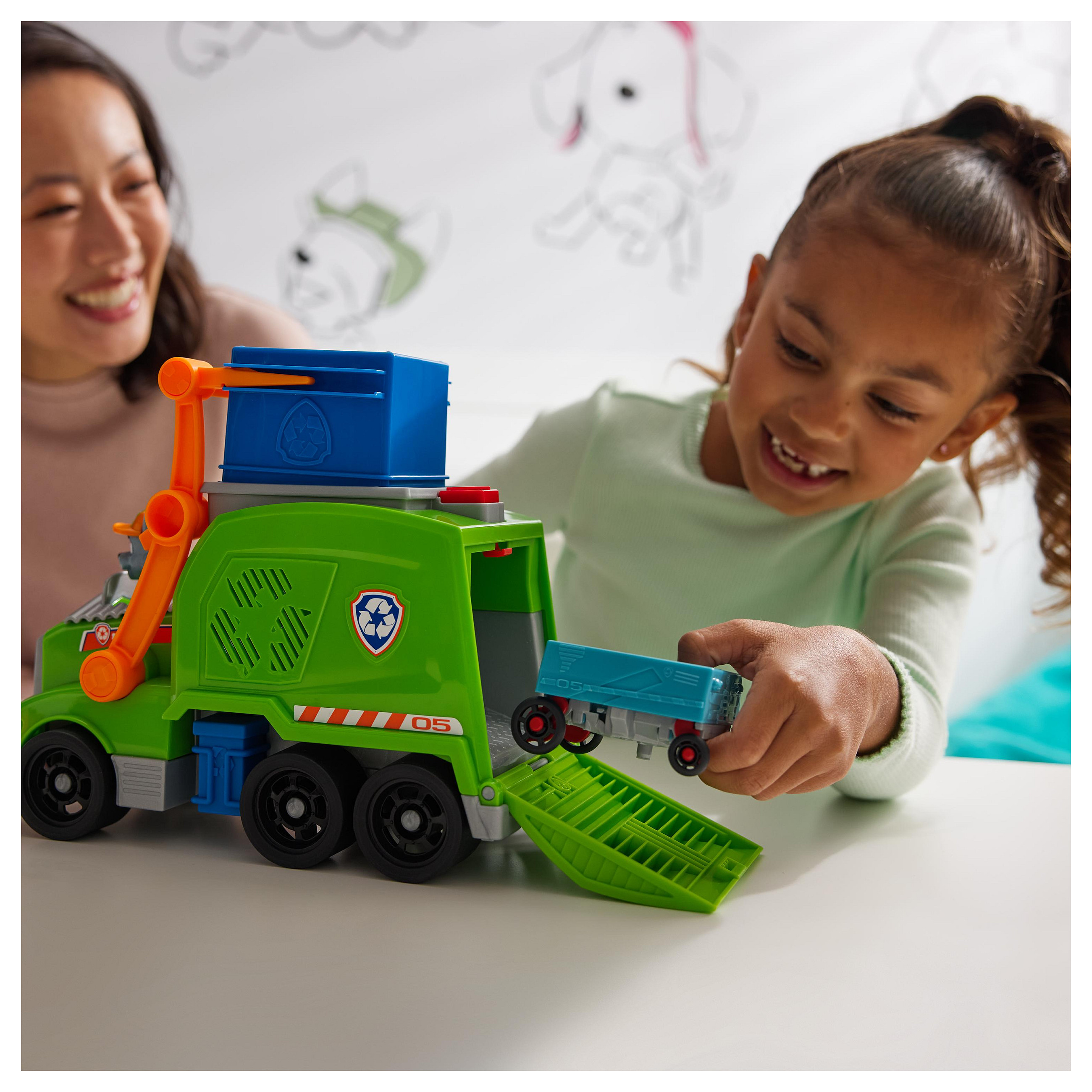 Rocky, der Recyclingspezialist aus der beliebten TV-Serie PAW Patrol, stellt sich mit seinem Deluxe-Recycling Truck aus den YouTube Episoden "Rocky´s Garage" den wirklich kniffligen Aufgaben. Mit authentischen Details, funktionierenden Rädern und tollen Spezial-Funktionen ist Rockys Deluxe-Fahrzeug bereit für spannende Abenteuer. Über eine Gabel am Fahrzeug kann mit einer Tonne Müll ins Fahrzeug verladen, abtransportiert und ausgeladen werden. Aber das Beste kommt erst noch: die Ladung wird im Truck in ein kleines Fahrzeug verwandelt, das Rocky fahren kann! Die mitgelieferte Rocky-Figur ist ca. 7 cm groß (Maßstab der klassischen Hero Pups Figuren) und kann im Fahrersitz des Deluxe Fahrzeugs befestigt werden. Das Spiel mit Rocky und seinem Recycling-Truck regt die kindliche Fantasie zu Rettungsmissionen an, die sich um Freundschaft, Teamwork und Mut drehen. Zusammen mit den anderen Welpen und ihren Rettungsfahrzeugen (jeweils separat erhältlich) kann Rocky die Welt in der Abenteuerbucht in wuffigen Team-Abenteuern noch besser retten!