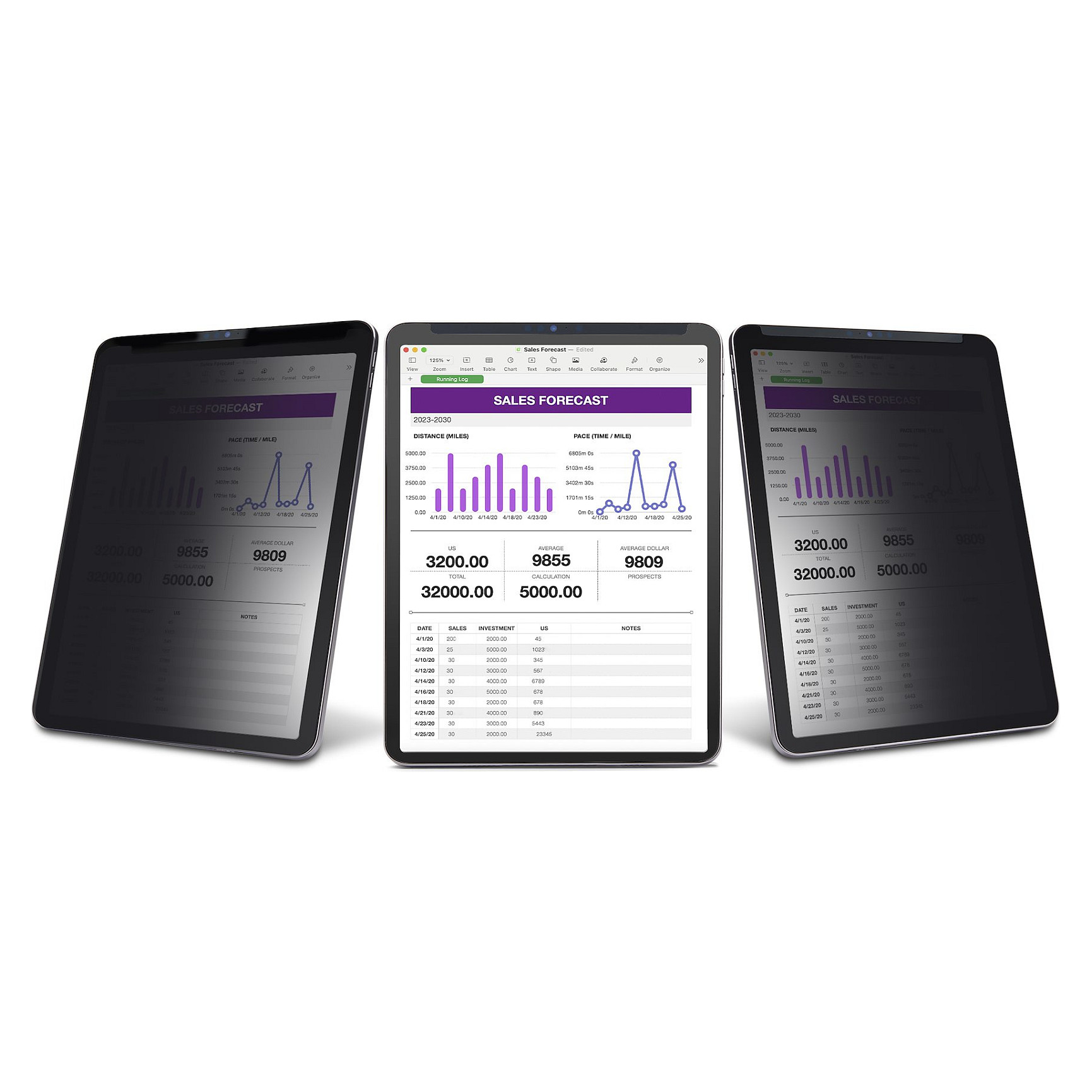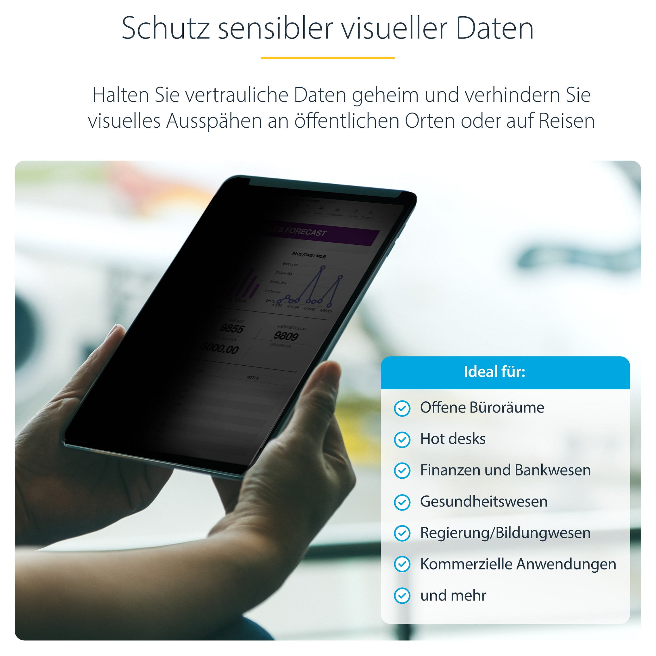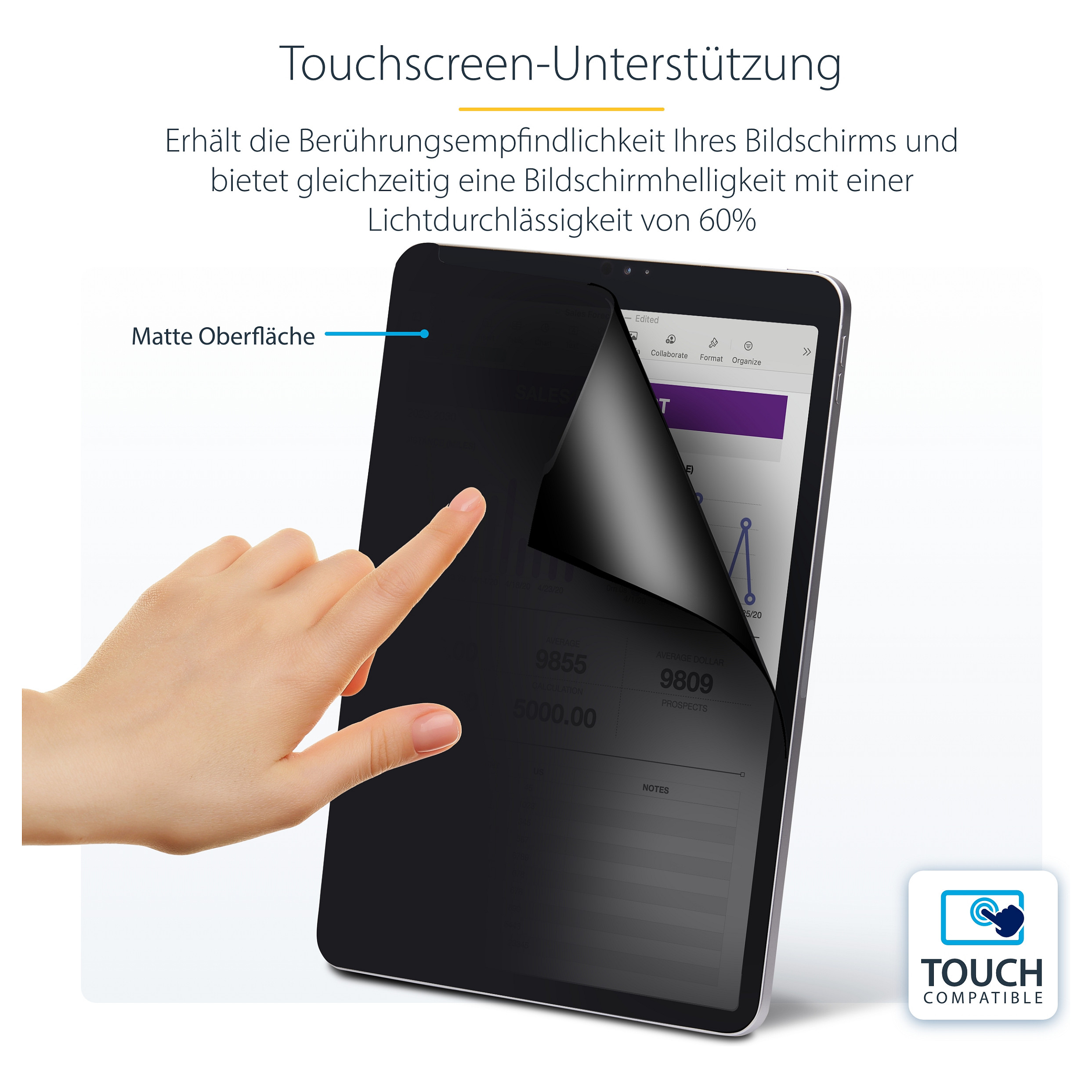 Der Sicherheitsfilter sorgt für optimale Privatsphäre im Hoch- oder Querformat, wenn Sie das iPad mehr als 30° von der Mitte aus betrachtet wird, und deckt einen sichtbaren Bereich von insgesamt 60° ab. Er unterstützt Touchscreen-Eingaben und Gesten, so dass das interaktive Erlebnis des iPad erhalten bleibt und gleichzeitig die Vertraulichkeit der Bildschirminhalte gewahrt wird.