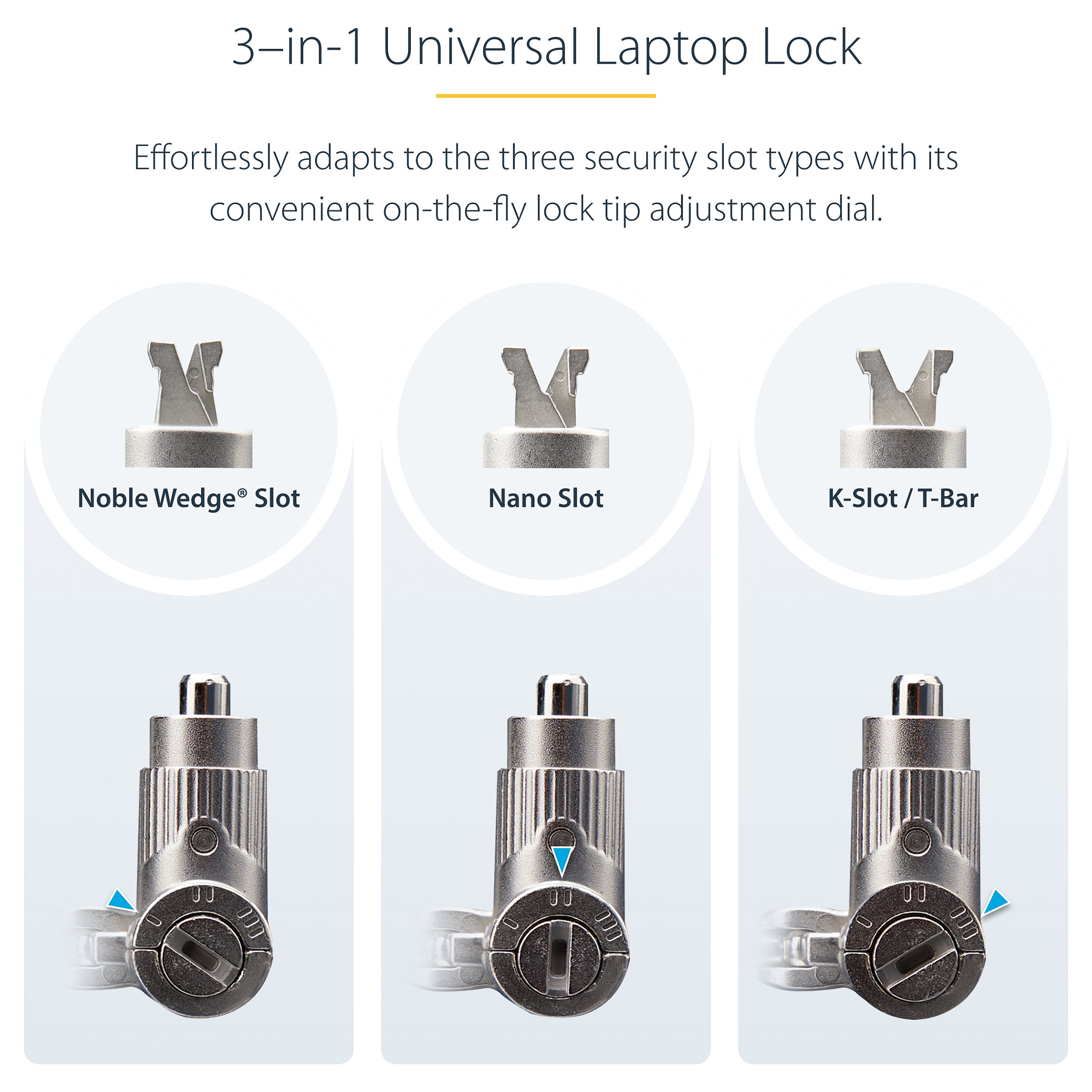 Ein einzigartiger Mechanismus zur schnellen Anpassung der Schlossspitze an verschiedene Sicherheitsschlitze. Drehen Sie einfach das Auswahlrad für das Schloss, um die Form der Schlossspitze an den jeweiligen Sicherheitsschlitz anzupassen, ohne dass Sie verschiedene Schlossspitzen mit sich führen oder Spezialwerkzeuge verwenden müssen. Das schnittfeste Sicherheitskabel aus Stahl ist 2m lang und 4,4mm dünn und bietet Reichweite und Haltbarkeit.