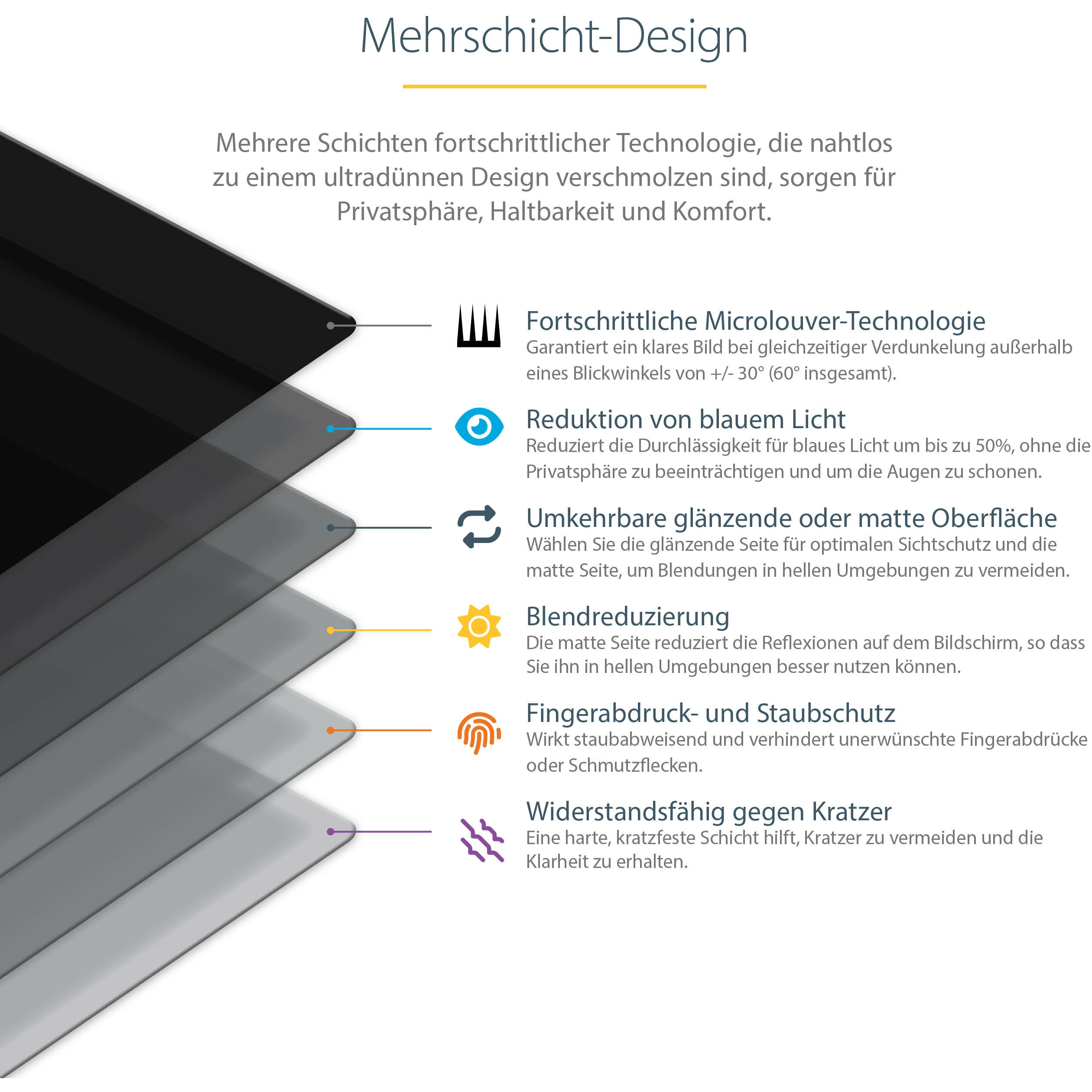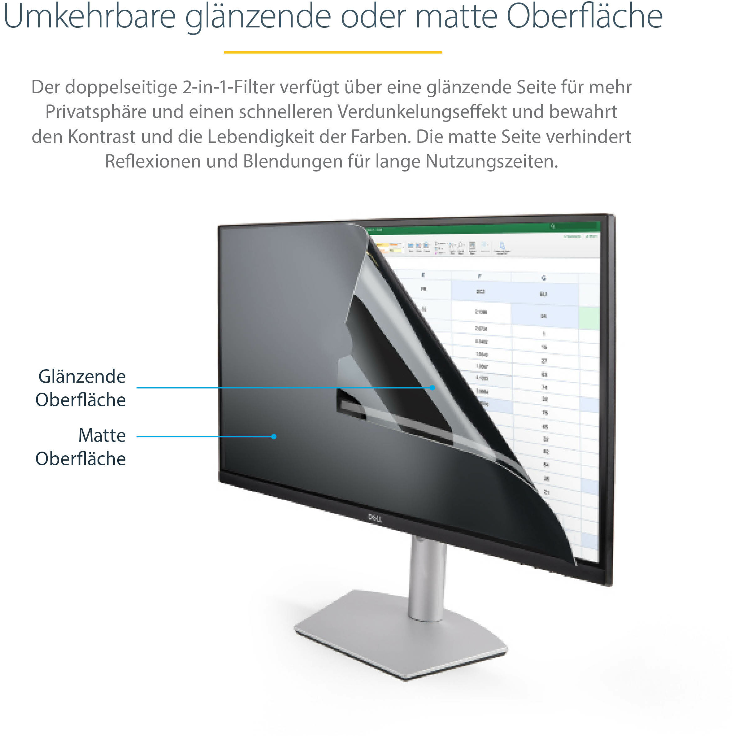 Der Bildschirmsichtschutz lässt sich ganz einfach am Monitor anbringen und entfernen. Befestigen Sie einfach die 27-Zoll-Sichtschutzabdeckung mit den Befestigungsstreifen oder den Gleitlaschen am Computerbildschirm, der ein Seitenverhältnis von 16:9 hat. Dieser Bildschirmsichtschutz ist auch wendbar. Die matte Seite sorgt für eine Reduzierung von Blendeffekten und die glänzende Seite des Bildschirmsichtschutzes für große Klarheit der Darstellung.
