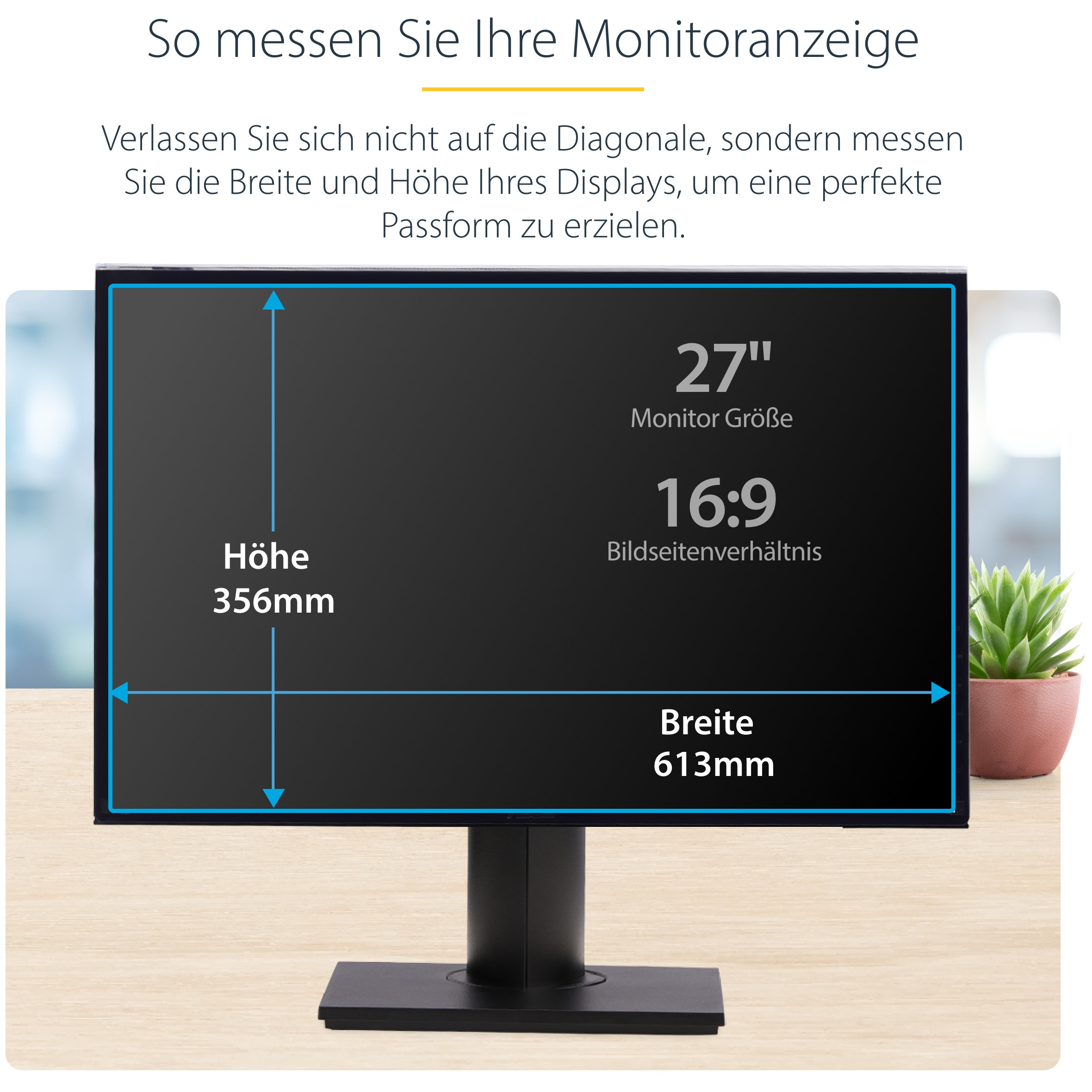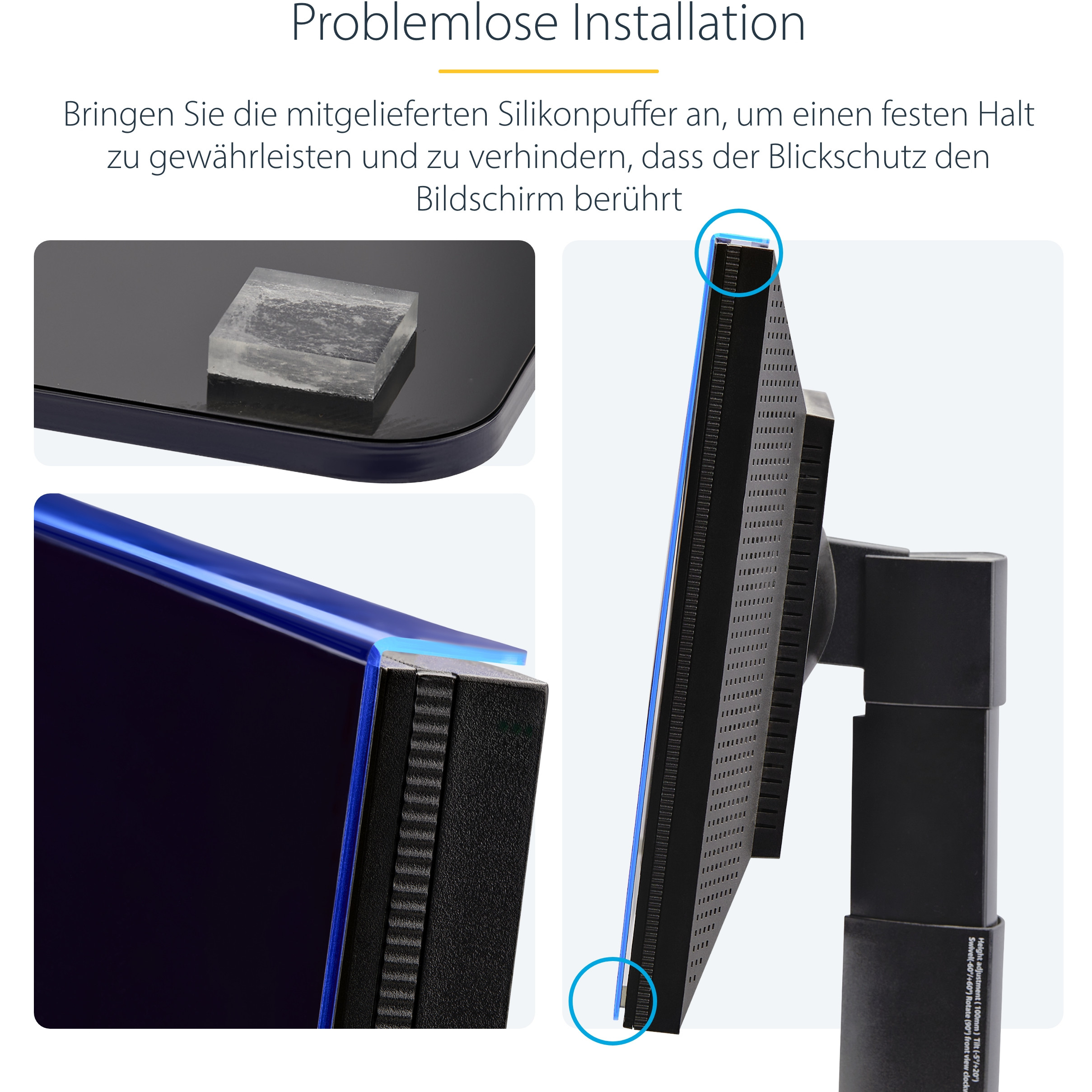 Hängen Sie diesen universellen 27" Monitor-Sichtschutz im Seitenverhältnis 16:9 an den oberen Rand eines 27" Monitors, um die Sicht auf sensible Informationen auf dem Bildschirm zu verdecken. Die Silikonpuffer sorgen für eine sichere und beschädigungsfreie Anbringung.