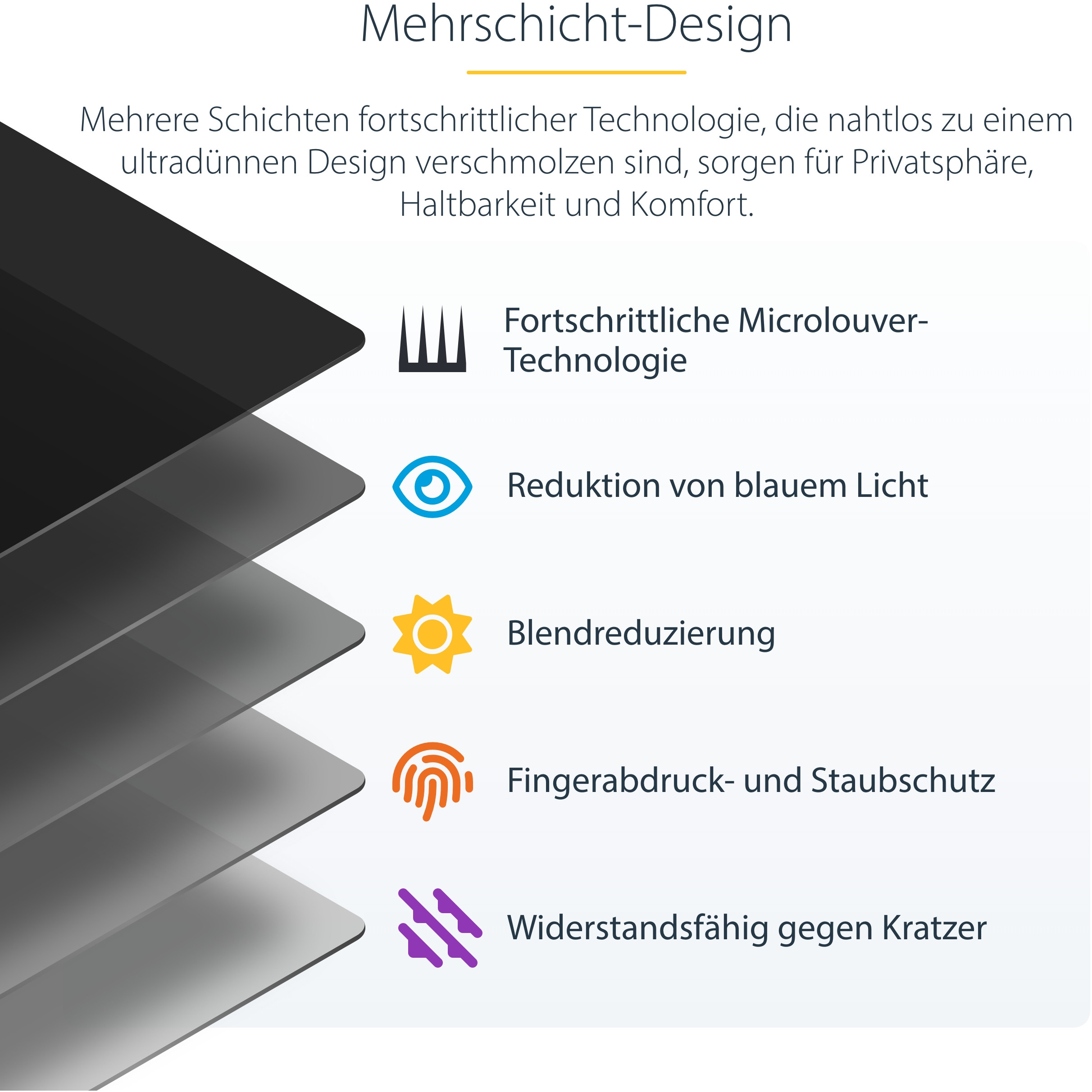 Dank des hängenden Designs können Sie den Sichtschutz einfach anbringen oder schnell entfernen, wenn Sie keine Privatsphäre benötigen oder wenn Sie Inhalte mit einem vertrauten Publikum teilen möchten. Der Blickschutz bietet eine Lichtdurchlässigkeit von 65% und sorgt so für eine optimale Bildschirmhelligkeit bei verbesserter Privatsphäre.