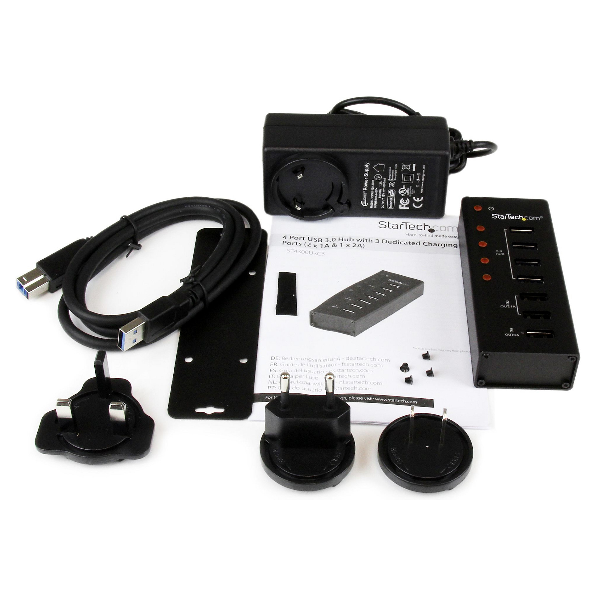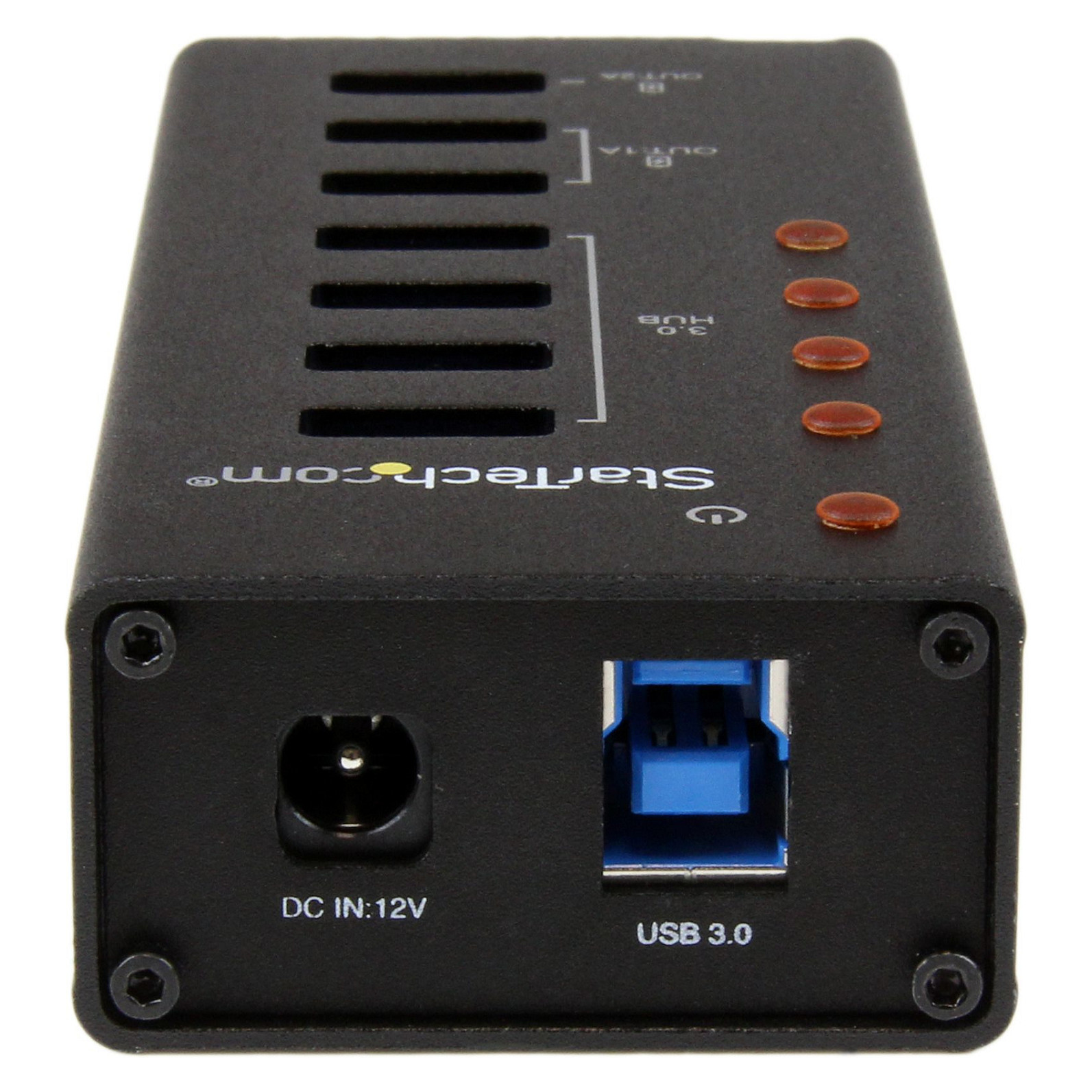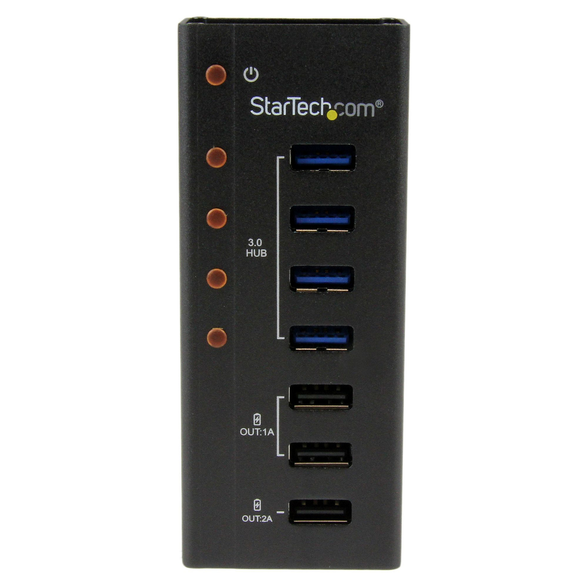 Der USB 3.2 Gen 1-Hub ST4300U3C3 bietet gleichzeitige Daten-Hub- und USB-Ladefunktionen durch Hinzufügen von drei dedizierten USB-Ladeanschlüssen und vier USB 3.2 Gen 1-Datenanschlüssen, also insgesamt sieben Anschlüsse über eine einzige USB 3.2 Gen 1-Host-Verbindung. Die USB-Hub-Anschlüsse entsprechen der SuperSpeed USB 3.2 Gen 1-Spezifikation, bieten Datenübertragungsraten von bis zu 5 Gbit/s und sind abwärts kompatibel mit USB 2.0 und 1.x. Dieser USB-Hub mit externer Stromversorgung integriert zudem 3 dedizierte USB-Ladeanschlüsse mit 2x 1 A und 1x 2 A, sodass sowohl Daten-Hub- als auch USB-Ladefunktionen möglich sind. Dank Unterstützung für USB-Akkuladespezifikation 1.2 können Sie die meisten Mobilgeräte, einschließlich Apple® iPhone®. iPad®, Microsoft® Surface™, Samsung Galaxy Tab™ usw., laden. Der Hub ist durch die aufrechte Anordnung der Anschlüsse in einem kompakten und strapazierfähigen Metallgehäuse für einfachen Zugang zu den Ports beim Anschließen oder Trennen von Geräten konzipiert. Für zusätzliche Flexibilität wird der Hub mit einer Halterung für Wandmontage geliefert.