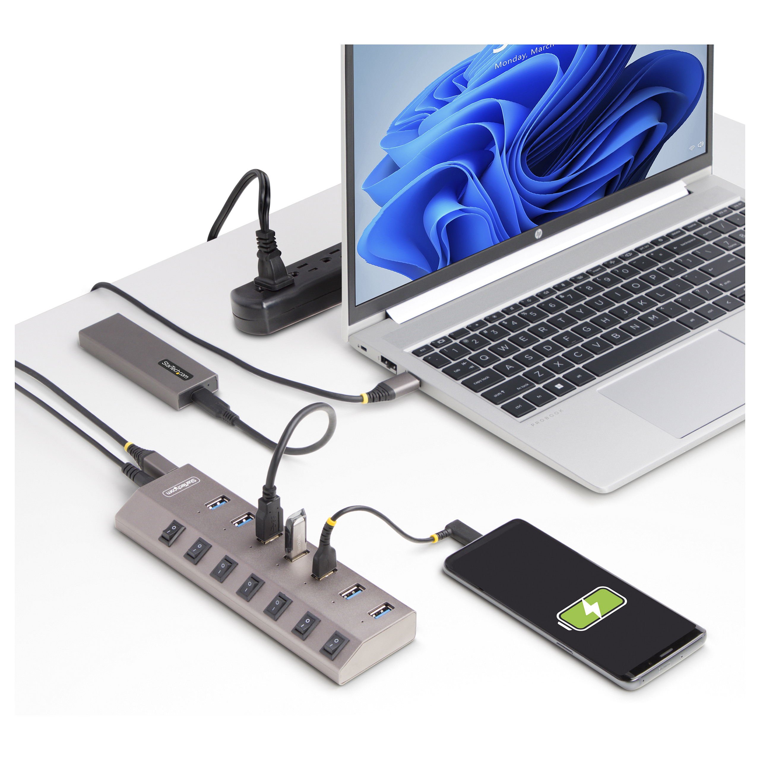Die sieben Anschlüsse des USB Hubs verfügen über einen Betriebsschalter, mit dem der Daten-/Stromanschluss des Computers an das angeschlossene Gerät abgeschaltet werden kann, wenn es nicht benutzt wird. Das bedeutet, dass Sie einzelne USB-Anschlüsse ausschalten können, um den Stromverbrauch zu senken, ohne dass Sie das Gerät oder das Kabel physisch abtrennen müssen. Außerdem kann diese Funktion die Privatsphäre schützen, indem sie Kameras oder externe Geräte mit sensiblen Daten ausschaltet, wenn sie nicht benutzt werden.