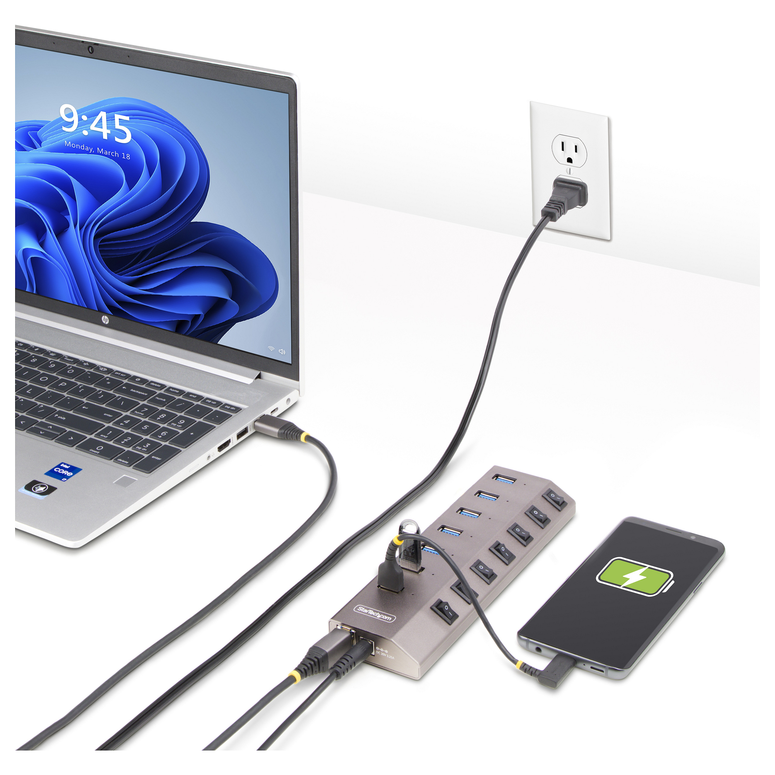 Der USB Hub wird mit einem inklusiven 65W Netzteil betrieben. Dadurch unterstützen alle sieben Anschlüsse dieses USB Hubs BC 1.2 und liefern gleichzeitig 1,5 A (7,5 W) Strom (52,5 W insgesamt), wodurch er ideal zum Aufladen von batteriebetriebenen USB-Geräten wie Smartphones und Tablets geeignet ist und gleichzeitig eine Datenverbindung bietet. Der USB Hub kann mit oder ohne angeschlossenen Host Computer betrieben werden und unterstützt sowohl CDP (Charging Downstream Port) als auch DCP (Dedicated Charging Port) Anwendungen.