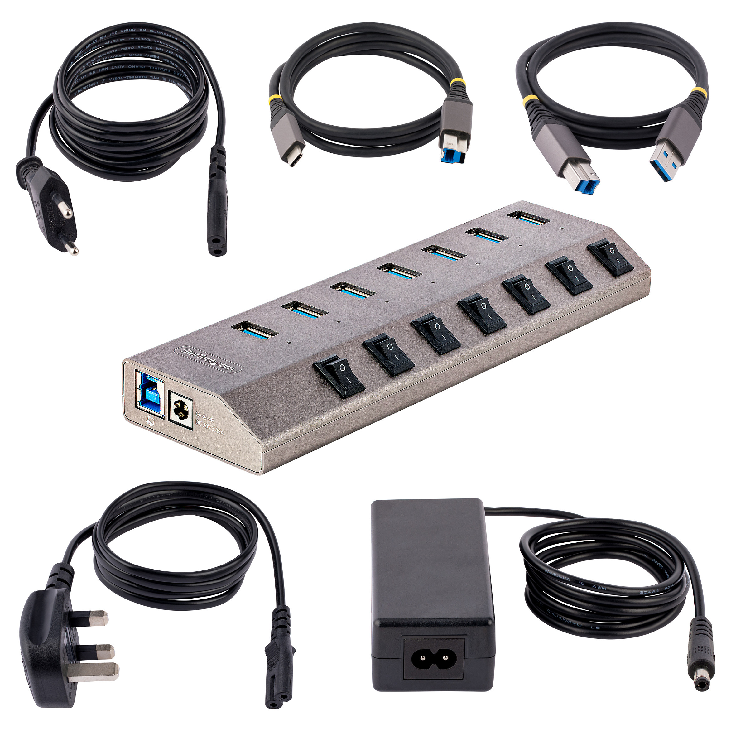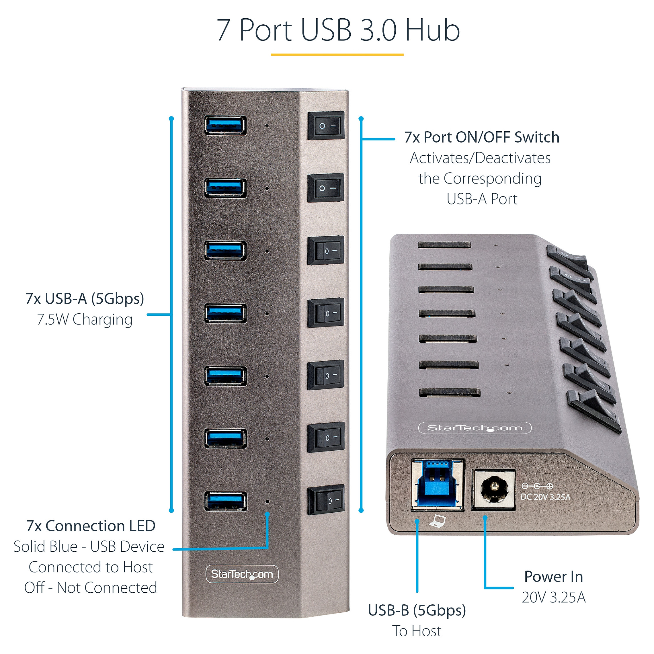 Dieser 7-port USB 3.2 Gen 1 (5Gbit/s) Hub fügt einem Computer sieben USB Typ-A Anschlüsse hinzu, wobei jeder Anschluss über einen individuellen Ein/Aus Schalter verfügt. Der USB Hub wird über einen inklusiven Netzteil Adapter mit Eigenstrom betrieben. Er wird mit einem USB-A oder USB-C Anschluss an einem Laptop oder Desktop Computer verbunden.