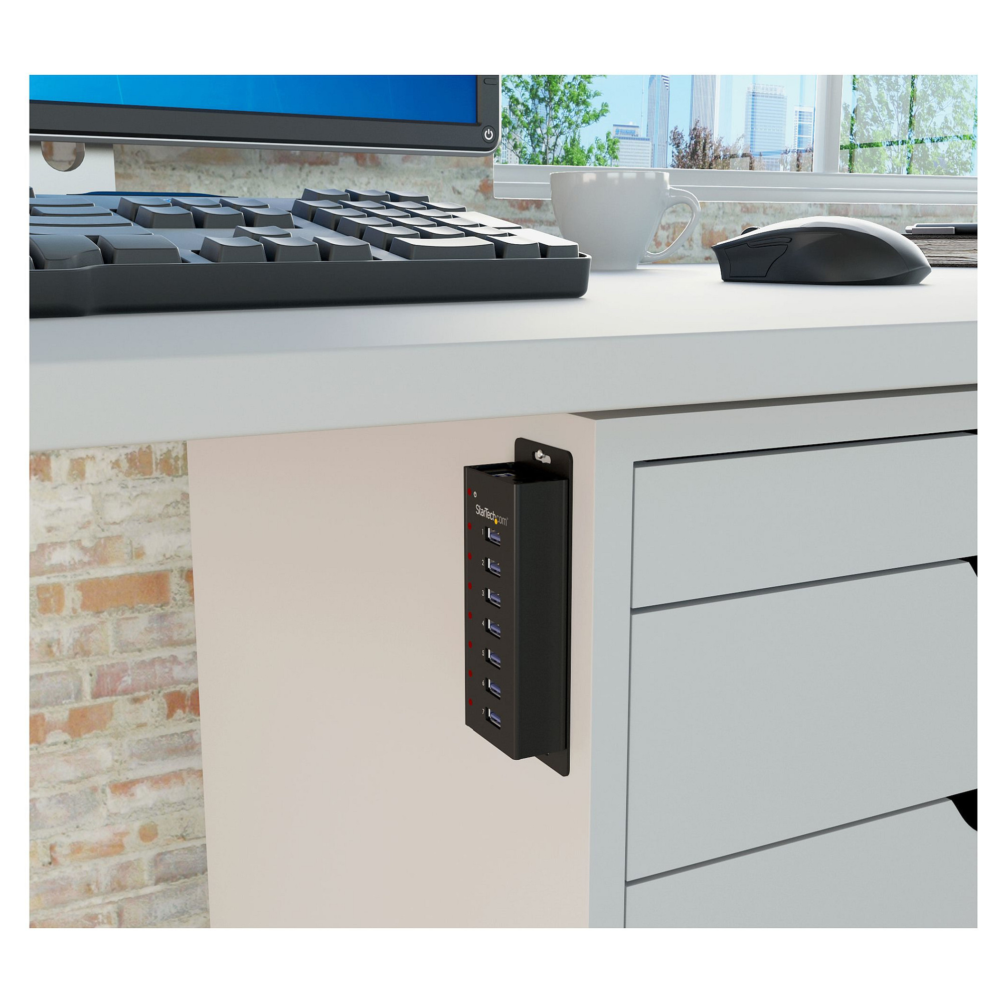Der 7-Port-USB 3.2 Gen 1-Hub von StarTech.com ist als strapazierfähiger und kompakter Hub die ideale Lösung für den Schreibtisch und unterwegs. Genießen Sie Komfort am Schreibtisch oder Mobilität unterwegs Der Hub ist hervorragend für die dauerhafte Einrichtung bei einem Desktopcomputer geeignet, dank einem robusten Metallgehäuse, das den Ansprüchen des täglichen Gebrauchs gewachsen ist. Zudem können Sie ihn dank der mitgelieferten Wandmontagehalterung auf einer Oberfläche, wie dem Schreibtisch oder der Wand, befestigen. Dank der kompakten Größe und der Strapazierfähigkeit ist der Hub auch sehr mobil. Unterwegs widersteht das robuste Design den Strapazen, die auf Reisen oder auf dem Weg zwischen Büro und Zuhause üblich sind. Schließen Sie Geräte schnell und einfach an Die Ports dieses Hubs sind aufrecht angeordnet, sodass sie hervorragend für IT-Profis oder andere Personen geeignet sind, die USB-Geräte regelmäßig anschließen und trennen müssen. Sie haben viel Platz, um die Stecker zu fassen ohne die Sorge, dass übergroße Stecker zu viel Platz beanspruchen oder die Anzahl der verfügbaren Ports reduzieren. Dank zusätzlicher USB 3.2 Gen 1-Anschlüsse können Sie die Produktivität erhöhen und mehr Geräte an Ihren Computer anschließen oder einfach das aufwendige Wechseln von angeschlossenen Geräten an Laptops mit einer geringen Anzahl von Anschlüssen vermeiden. Der Hub erleichtert den Zugang zu den USB-Anschlüssen und erweitert die Reichweite Ihrer Geräte, indem er als Repeater in der Mitte dient. Zur Verwendung mit Hochleistungsgeräten und älteren Geräten Der ST7300U3M unterstützt die neuesten USB 3.2 Gen 1-Produkte, einschließlich UASP-fähiger Speichergeräte. Dank Datenübertragungsgeschwindigkeiten von bis zu 5 Gbit/s durch SuperSpeed USB 3.2 Gen 1-Technologie ist dieser Hochleistungshub das perfekte Zubehör für Desktopcomputer, Laptops, MacBook® oder UltraBook™. Sie können den Hub dank Unterstützung für USB 2.0- und 1.x-Geräte auch mit älteren Peripheriegeräten und Computern nutzen. Für die Installation sind keine zusätzlichen Treiber oder Software erforderlich.