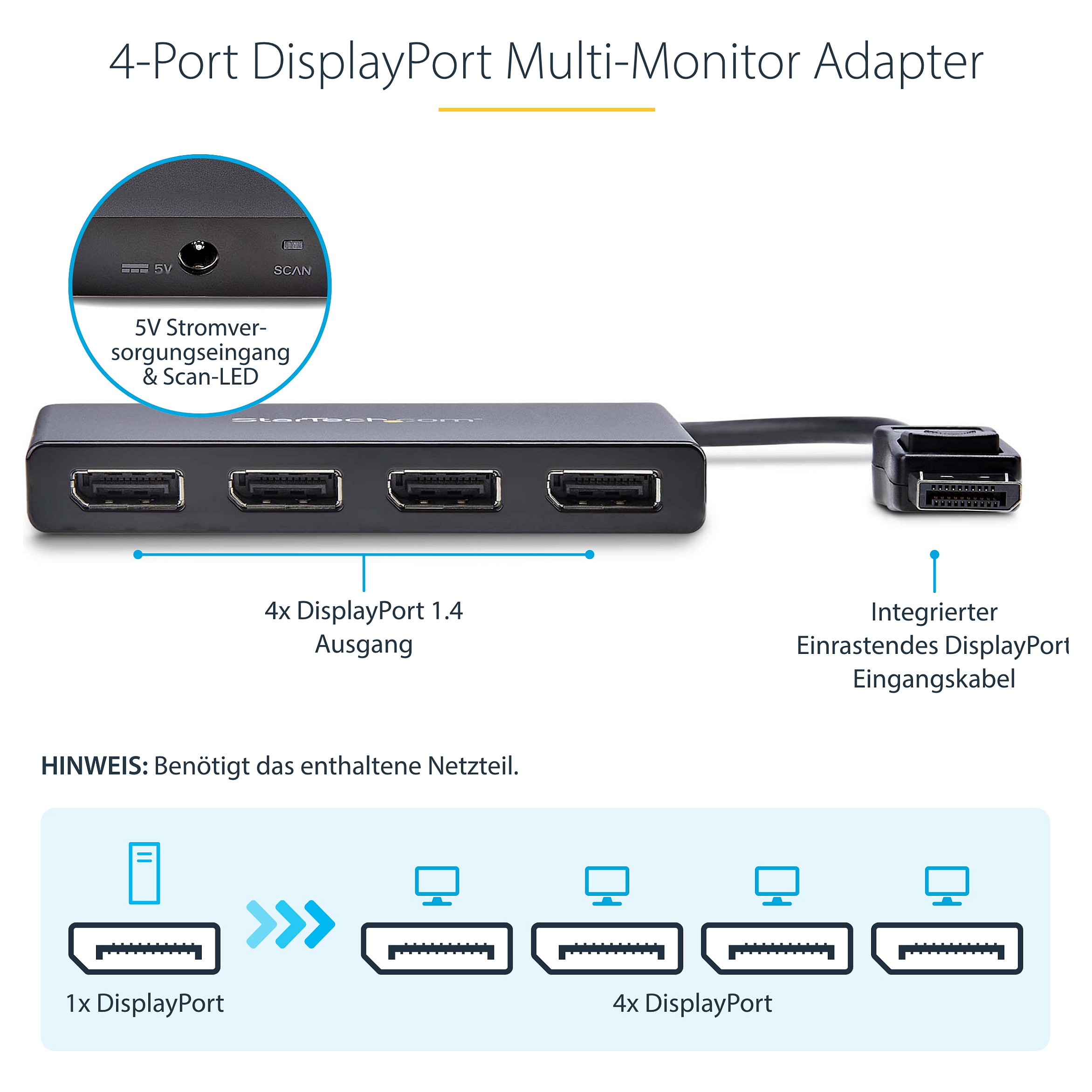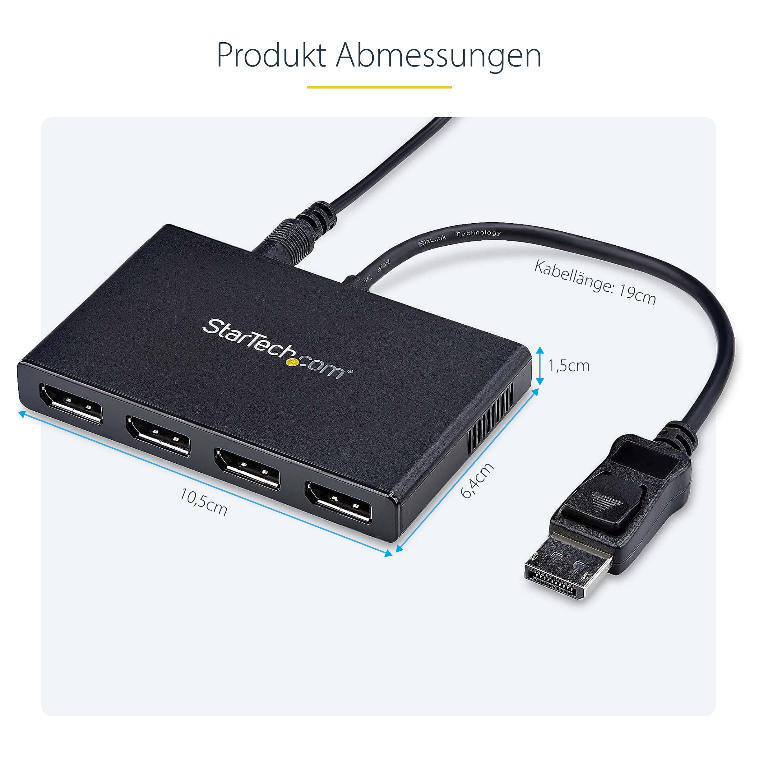 Benutzen Sie diesen Adapter, um vier unabhängige Bildschirme mit einem einzigen DP 1.2 Port zu verbinden