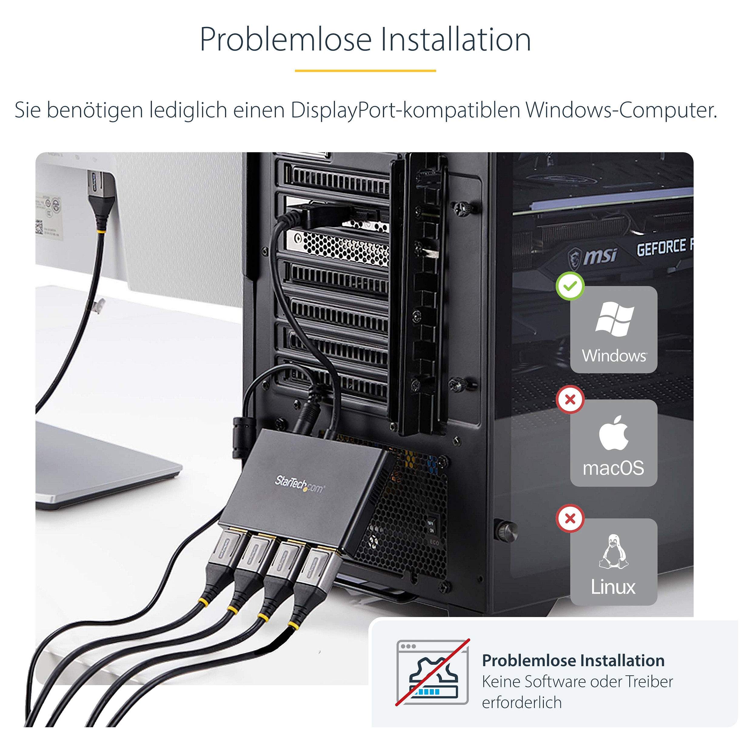 Mithilfe dieses MST-Hubs können Sie vier Monitore an einen DisplayPort™ (DP) 1.2-fähigen Windows®-Laptop oder Desktopcomputer anschließen.