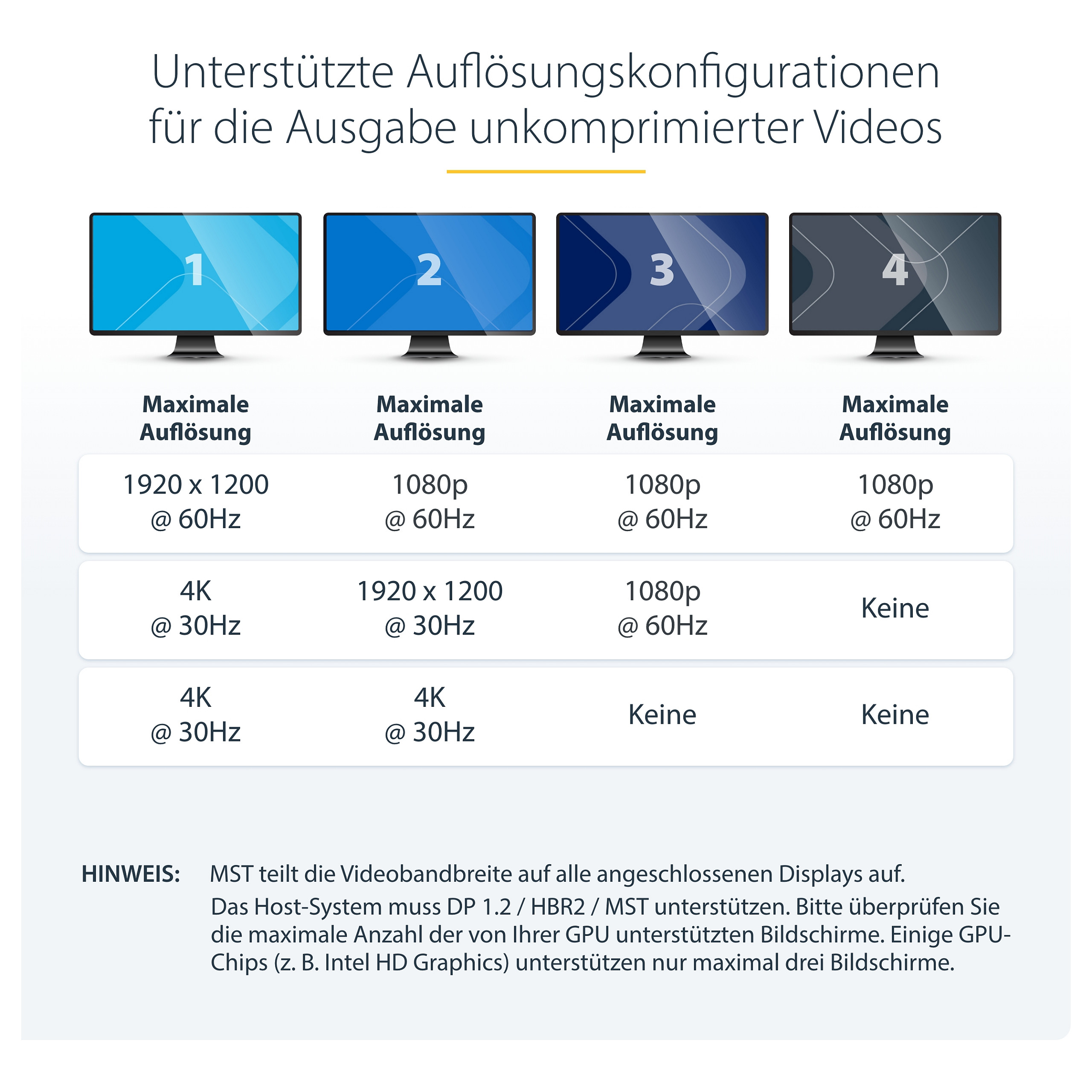 Hinweis: MST verteilt 21,6 Gbit/s auf alle angeschlossenen Displays. Höhere Auflösungen können die für die verbleibenden Ports verfügbare Bandbreite einschränken. Beachten Sie bitte folgende Hinweise, um die ideale Auflösung für Ihre Konfiguration zu ermitteln. Bestimmte Grafikadapter haben eine eingeschränkte MST-Unterstützung und geben nur insgesamt drei Displays aus. Wenn mehr als drei Monitore angeschlossen werden, wird der vierte Bildschirm deaktiviert.