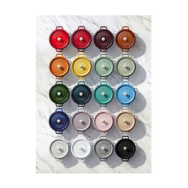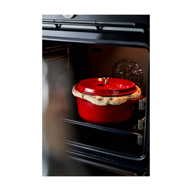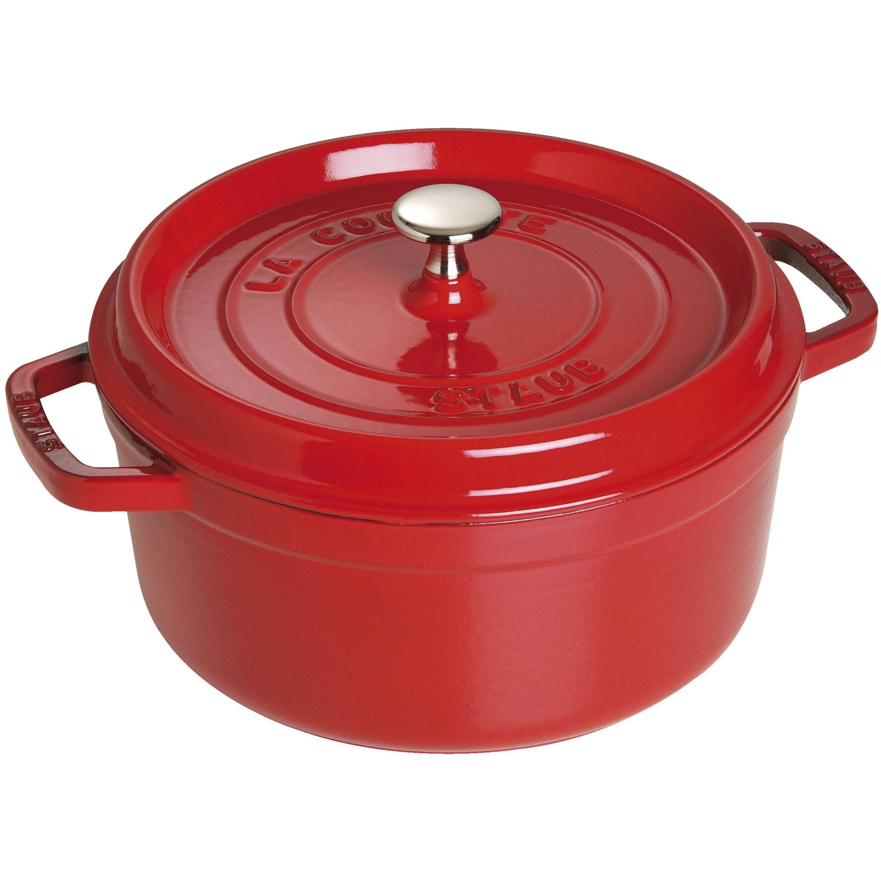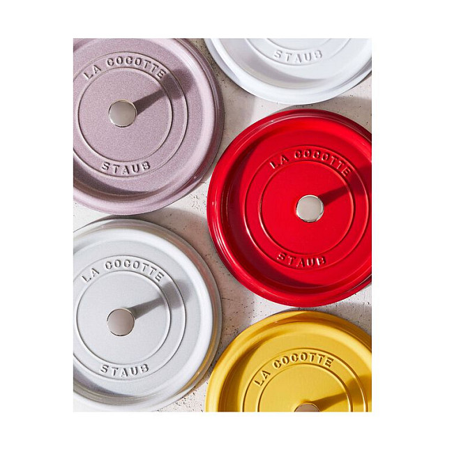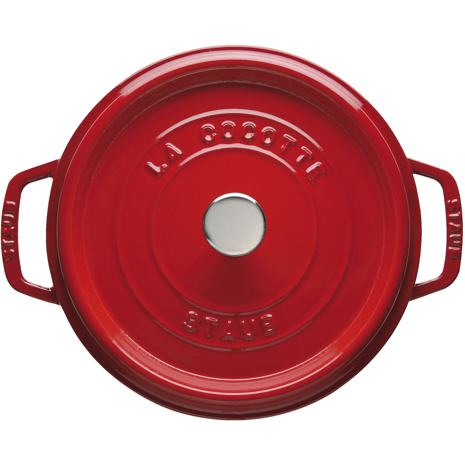 Ein saftiger Braten ist nicht nur sonntags ein kulinarischer Hochgenuss. Ob Fleischgerichte, Gemüseauflauf oder Fisch – in der Cocotte von Staub gelingen Ihnen feine Gerichte einfach und sicher. Die Cocotte ist ein gusseiserner Bräter, den Sie zur schonenden Zubereitung verschiedener Speisen verwenden können. Der Schmortopf ist dank seines klassischen Designs mit geprägtem Namen und einem silberglänzenden Knauf ein Kochgeschirr, in welchem Sie Ihre Gerichte zudem stilvoll am Tisch servieren. Die Cocotte hat einen Durchmesser von 24 cm, mit Griffen beträgt er rund 30 cm. Mit Deckel ist der Schmortopf von Staub etwa 15 cm hoch. Er hat ein Fassungsvermögen von 3,7 l. Die gusseiserne Cocotte ist auf der Innenseite mit einer mattschwarzen Emaillierung überzogen. Diese verleiht dem Gargut beim Anbraten ein hervorragendes Schmoraroma und verstärkt den Eigengeschmack der frischen Zutaten. Die Cocotte selbst speichert die Wärme und gibt sie langsam ab. So bleiben Ihre Speisen auch auf dem Tisch noch lange warm. Das gusseiserne Kochgeschirr von Staub eignet sich für die Zubereitung zahlreicher Gerichte. Mit der kirschroten Cocotte sorgen Sie auf Ihrem Tisch für einen stilvollen Blickfang und ergänzen Ihr Kochgeschirr um einen funktionalen, robusten und pflegeleichten Schmortopf, den Sie sicher zu vielen Gelegenheiten benutzen werden.