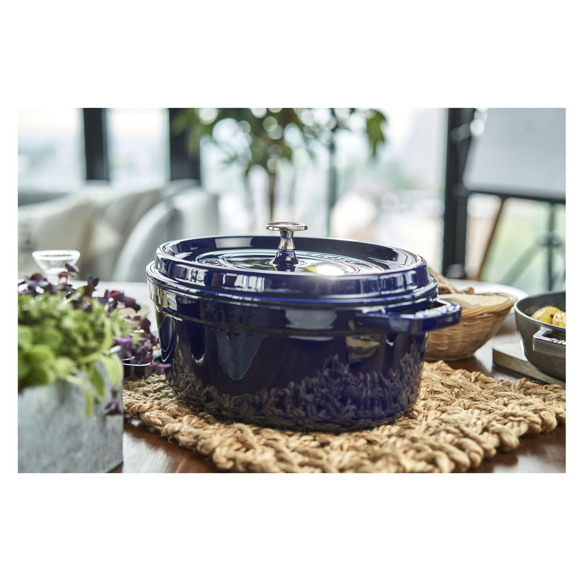 Die Cocotte von STAUB im maritimen Blauton vereint traditionelle Handwerkskunst mit moderner Funktionalität für einen einmaligen Genuss. Gefüllte Paprikaschoten, klassische Kohlrouladen, mediterranes Ratatouille, süße Desserts sowie frisches Brot und mehr – in diesem praktischen Gusseisentopf können die verschiedensten Gerichte zubereitet werden. Da das besondere Material nur wenig Fett zum Braten bedarf und der Schmortopf zugleich eine einzigartige Struktur aufweist, können die köstlichen Speisen kalorienarm gekocht werden und überzeugen mit ihren vollen Aromen und Nährstoffen. Durch die mattschwarze Emaille wird der Geschmack der Gerichte intensiviert, während das Gusseisen für eine optimale Hitzeverteilung sorgt. Sowohl Profi- als auch Hobbyköche finden in dem energiesparenden Iron Cast Topf einen langlebigen Helfer.
