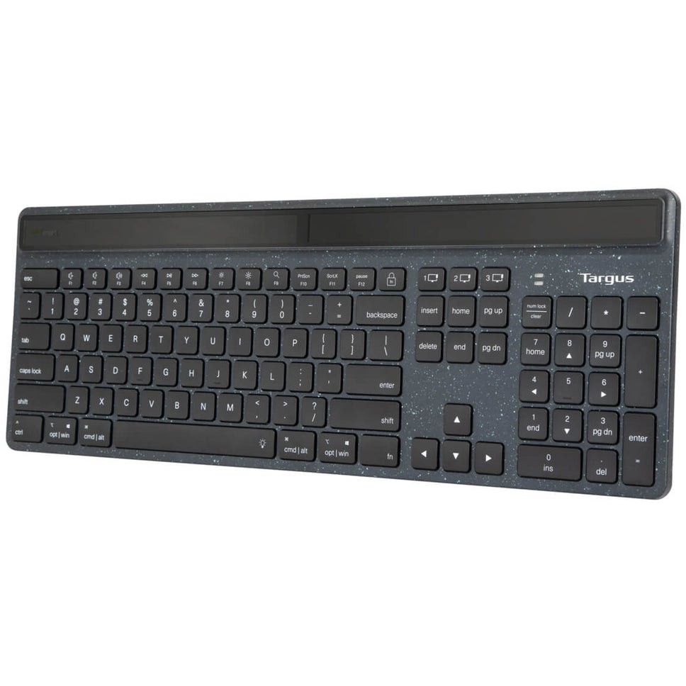 Targus Sustainable Energy Harvesting EcoSmart. Tastatur Formfaktor: Volle Größe (100%). Tastatur-Stil: Gerade. Übertragungstechnik: Kabellos, Geräteschnittstelle: Bluetooth, Tastatur-Switch: Scherenschalter, Tastaturaufbau: QWERTY. Typ der Hintergrundbeleuchtung: LED. Empfohlene Nutzung: Universal. Produktfarbe: Schwarz