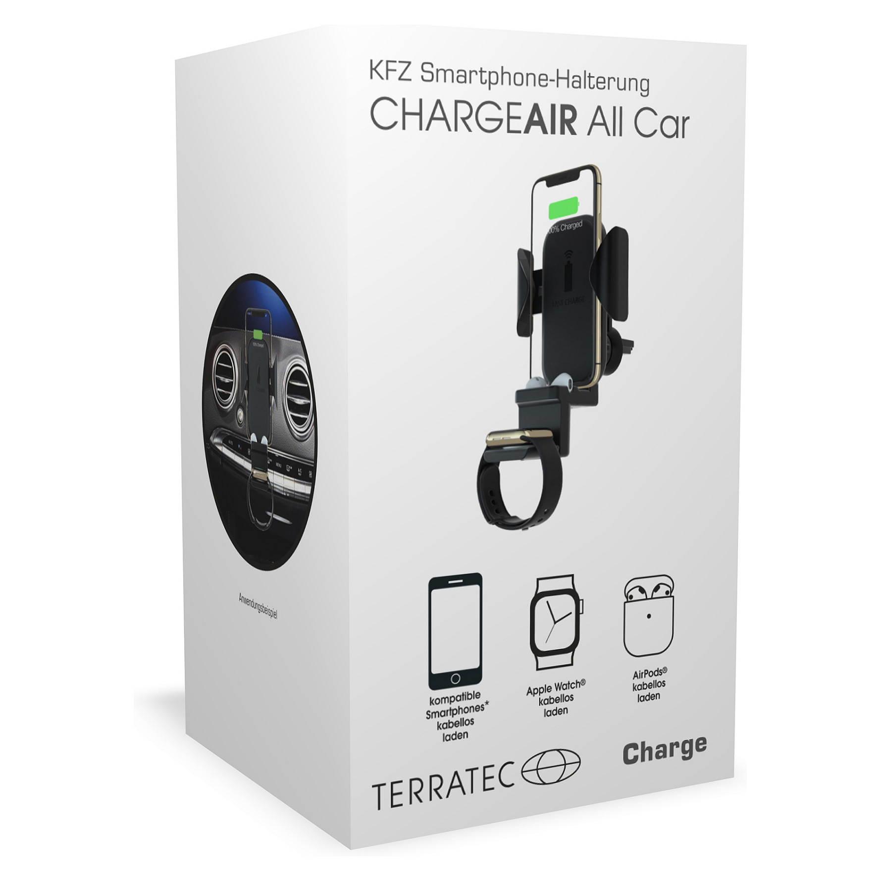 KFZ Smartphone-Halterung mit kabelloser Ladefunktion für Smartphones, Apple AirPods und Apple WatchesDer TERRATEC ChargeAir All Car nimmt sie alle mit: Die smarte KFZ-Halterung nimmt Smartphones, Apple AirPods und Apple Watches während der Fahrt nicht nur in Obhut, sondern lädt die mobilen Devices unterwegs kabellos auf. Chaos in der Mittelkonsole oder ein leerer Smartphone-Akku während der Navigation gehören mit der Induktionshalterung für die Lüftungsgitter der Vergangenheit an. Ein Schnellladeadapter für den Zigarettenanzünder und ein 100 cm USB auf Micro-USB Kabel liegen dem Charger bei.