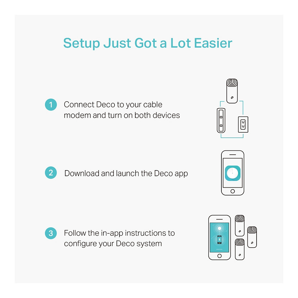 Platzieren Sie die Deco-Einheiten, installieren Sie die App und folgen Sie einfach den Anweisungen auf dem Bildschirm. Deco wird sich um den Rest kümmern und Ihr Netzwerk in wenigen Minuten konfigurieren.