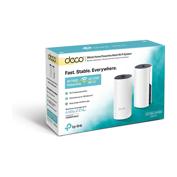 Koppeln Sie mit Alexa, um Deco P9 mit einfachen Sprachbefehlen zu steuern.AC1200, 2.4 + 5 GHz, 300 + 867 Mbps, 2x Gigabit LAN, 90.7 x 90.7 x 190 mm, 2-pack
