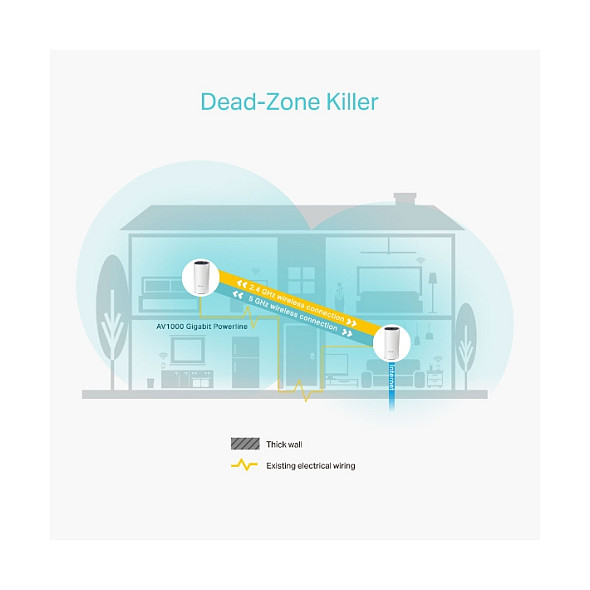 The hybrid whole-home system delivers extended coverage up to 4,000 ft2 / 370 m2 with the help of the combination of dual-band Wi-Fi and powerline. Eliminate weak signal areas with whole-home Wi-Fi and no more searching around for a stable connection.